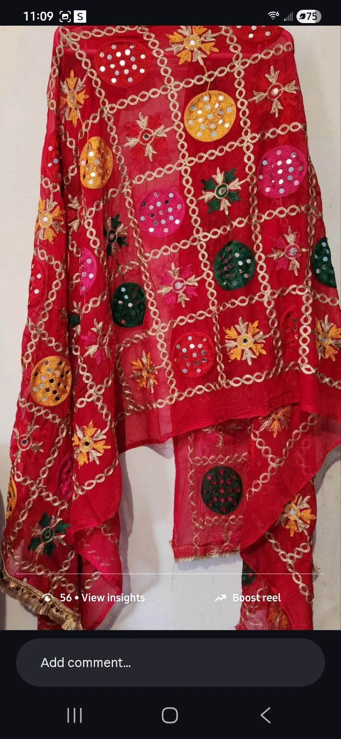 This is a vibrant red dupatta featuring intricate embroidery and mirror work. It's adorned with colorful circular and floral motifs. Measures approximately 2 yards in length. A beautiful accessory for traditional outfits!