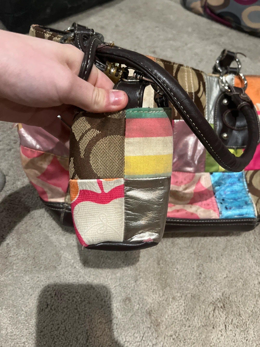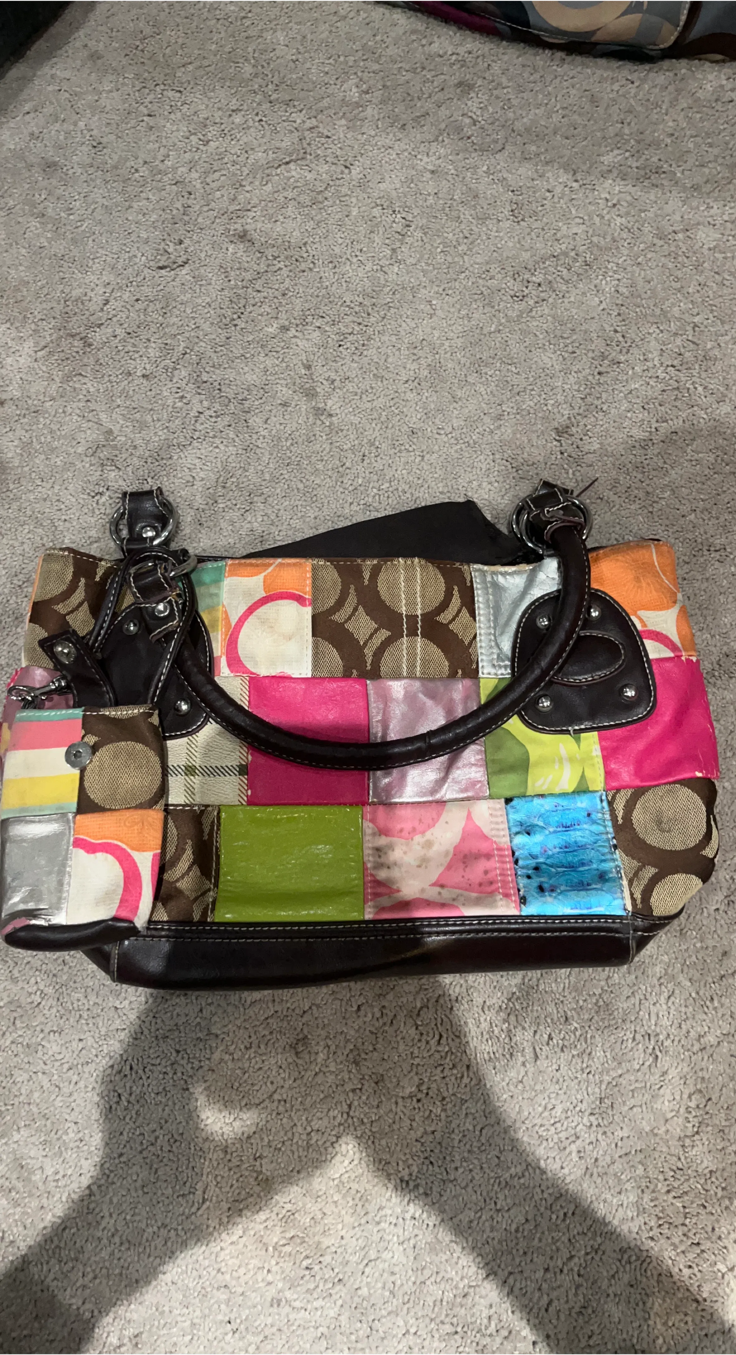 A colourful Coach patchwork shoulder bag with leather handles and trim. It features the iconic Coach C logo print mixed with vibrant blocks of colour and textured materials. This bag is a great statement piece for adding a pop of colour to any outfit!