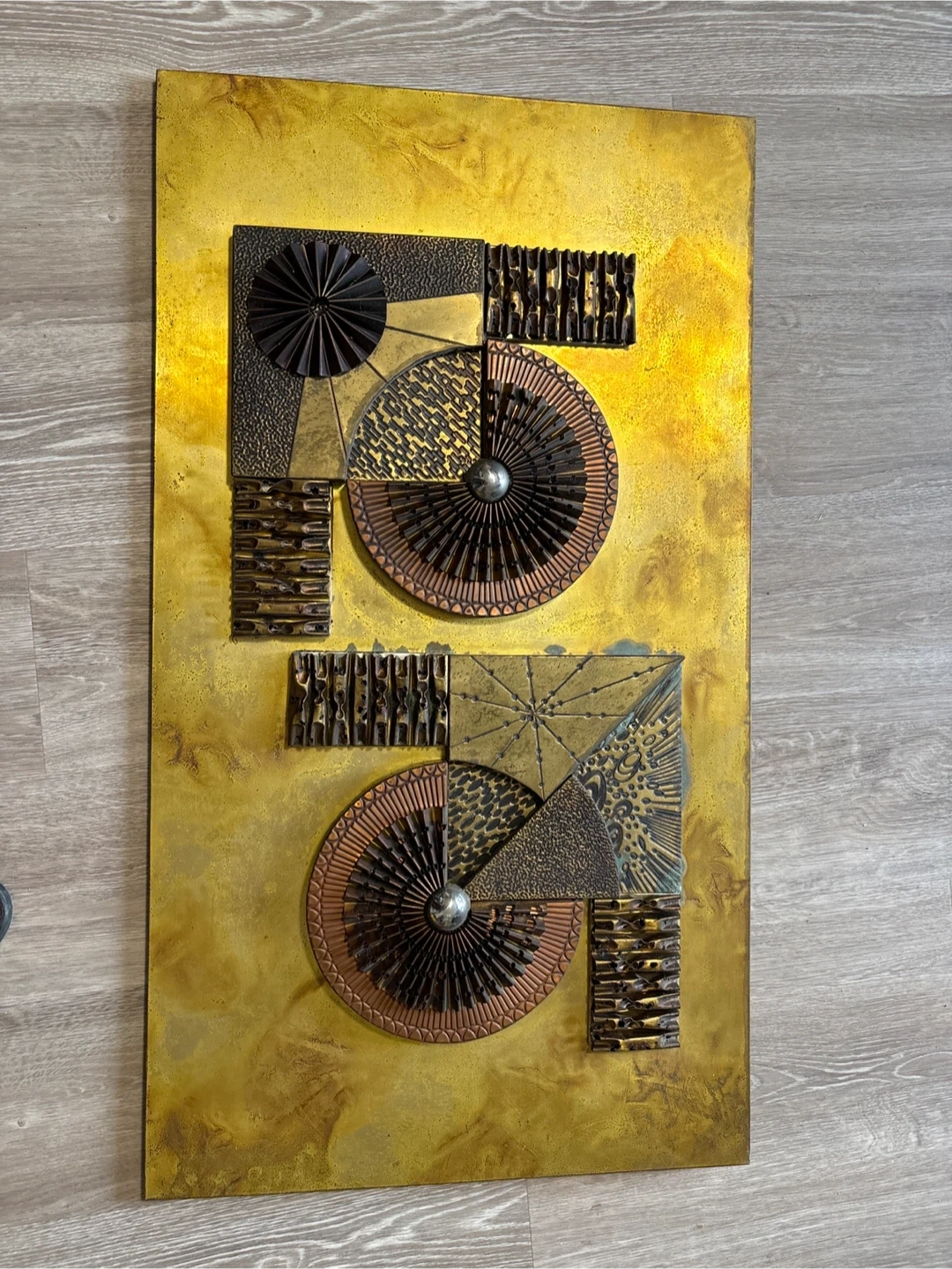 Unique textured metal wall art with a bold geometric design. Features circular and rectangular elements in bronze, copper, and brushed gold finishes. This striking piece will add a statement to any room! Perfect for above the fireplace.
