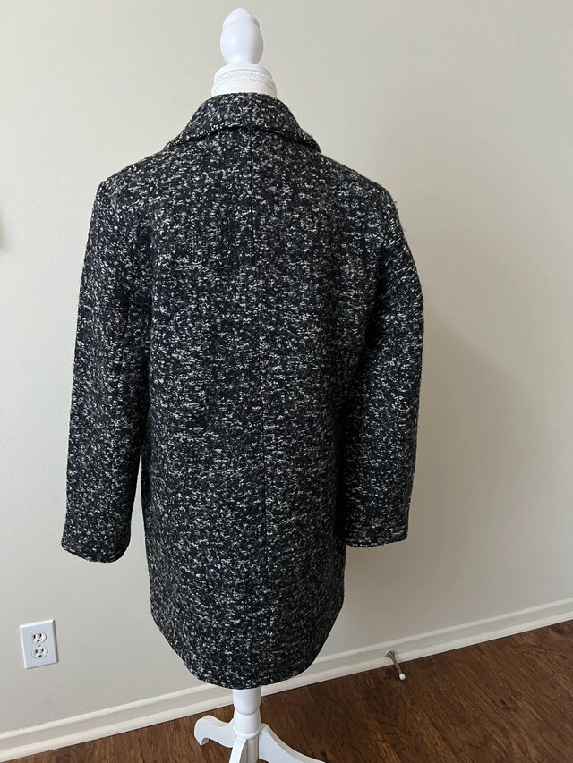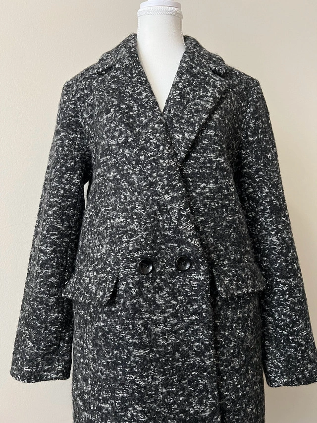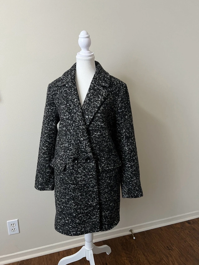 This Zara tweed coat is perfect for adding a touch of sophistication to any outfit, featuring a double-breasted button closure and a stylish, textured fabric, ideal for cooler weather. This is a new item, with tag still on. Additional details: * Style: Tweed Coat * Closure: Double-breasted button * Colour: Black and white tweed * Size: Large