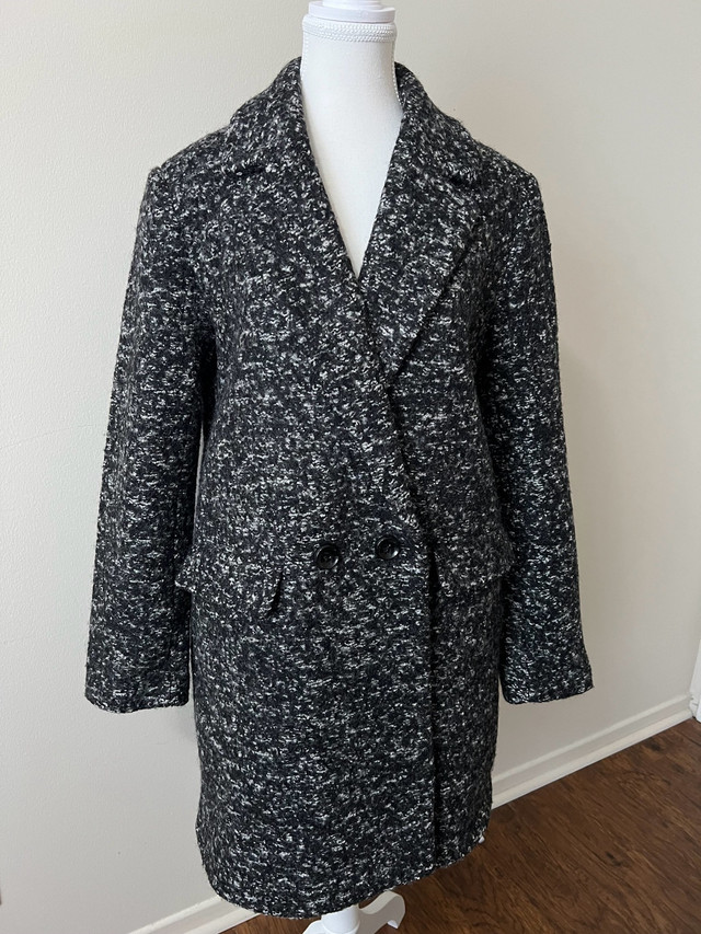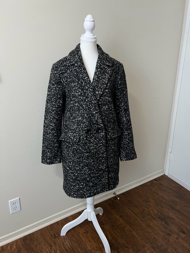 This Zara tweed coat is perfect for adding a touch of sophistication to any outfit, featuring a double-breasted button closure and a stylish, textured fabric, ideal for cooler weather. This is a new item, with tag still on. Additional details: * Style: Tweed Coat * Closure: Double-breasted button * Colour: Black and white tweed * Size: Large