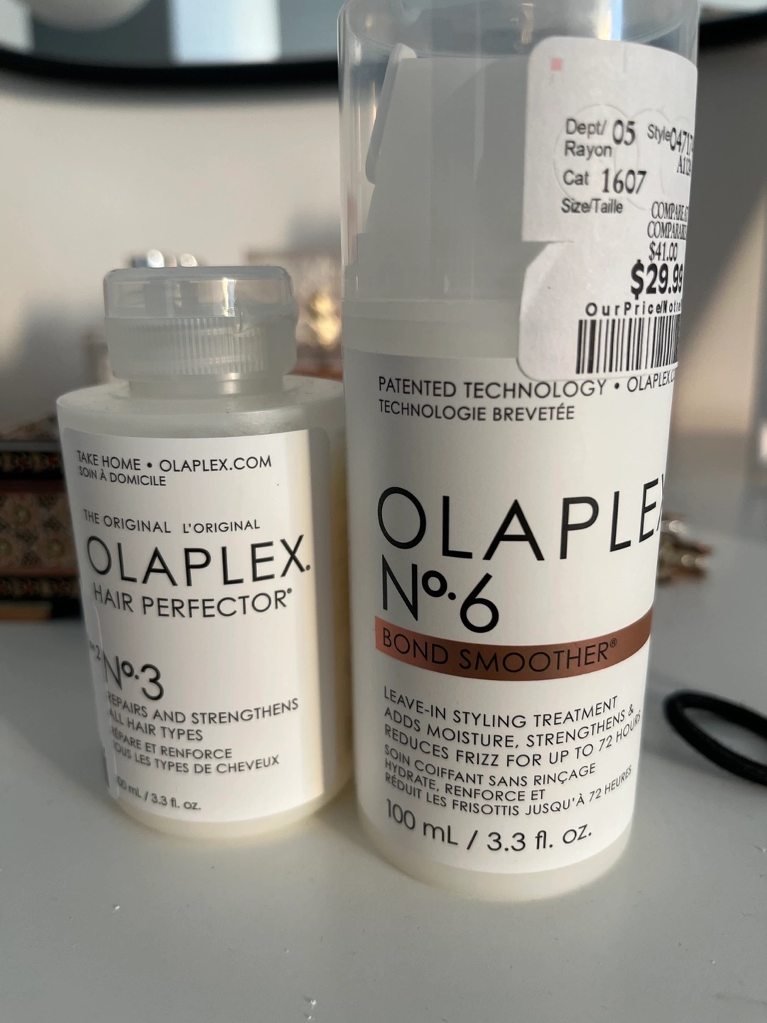 Olaplex hair products. No. 3 Hair Perfector and No. 6 Bond Smoother.