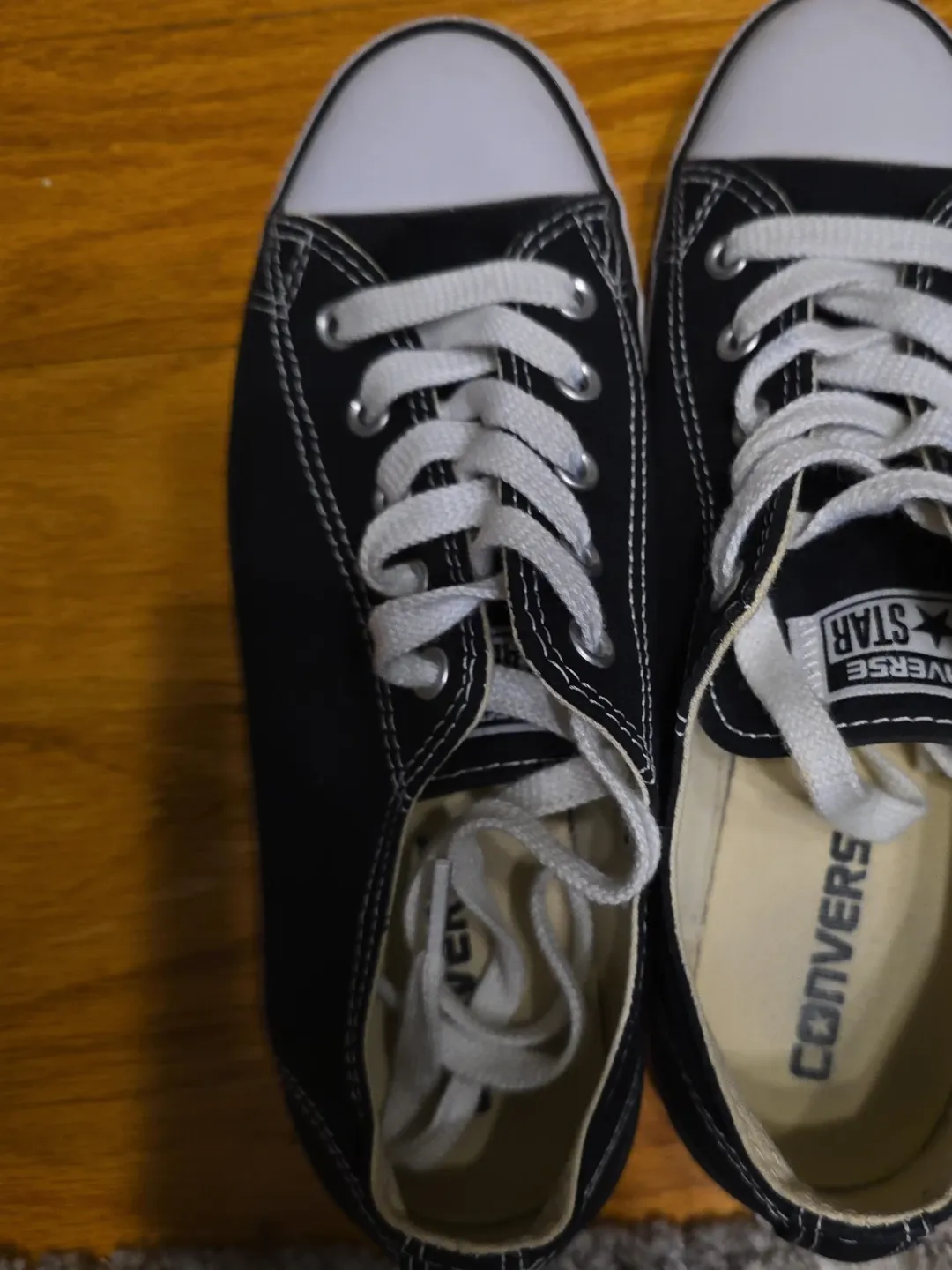 Classic black Converse All Star Chuck Taylor canvas shoes. Low-top style with white laces and rubber toe cap. Perfect for everyday wear!