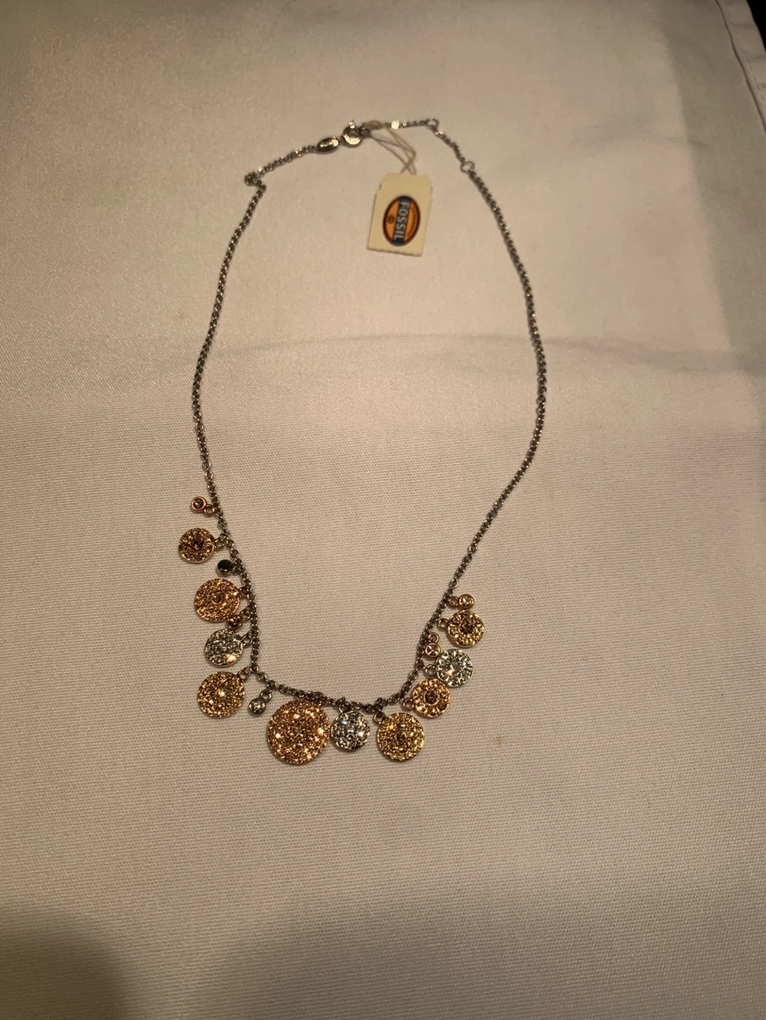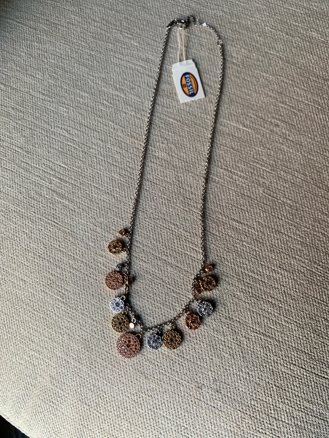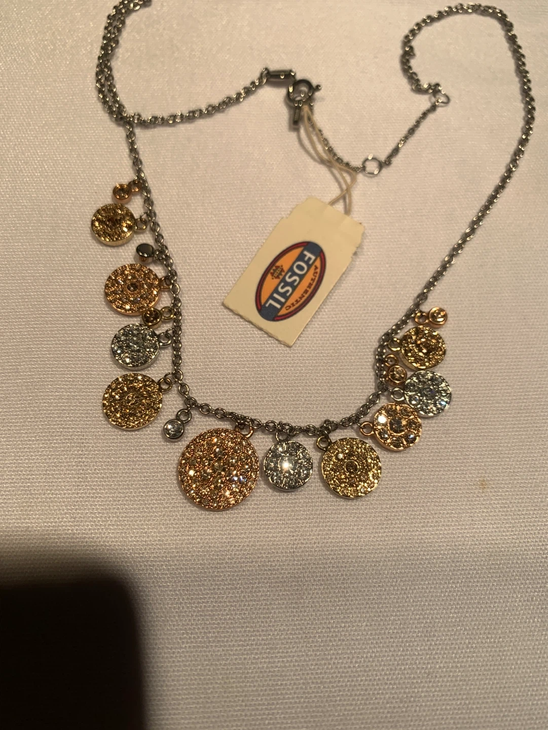 This Fossil necklace features a delicate silver-tone chain with an arrangement of sparkling disc-shaped charms. The charms are in a mix of gold, rose gold, and silver tones, some encrusted with clear crystals. It's a stylish accessory for everyday wear.
