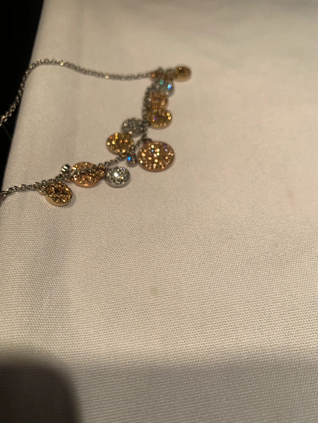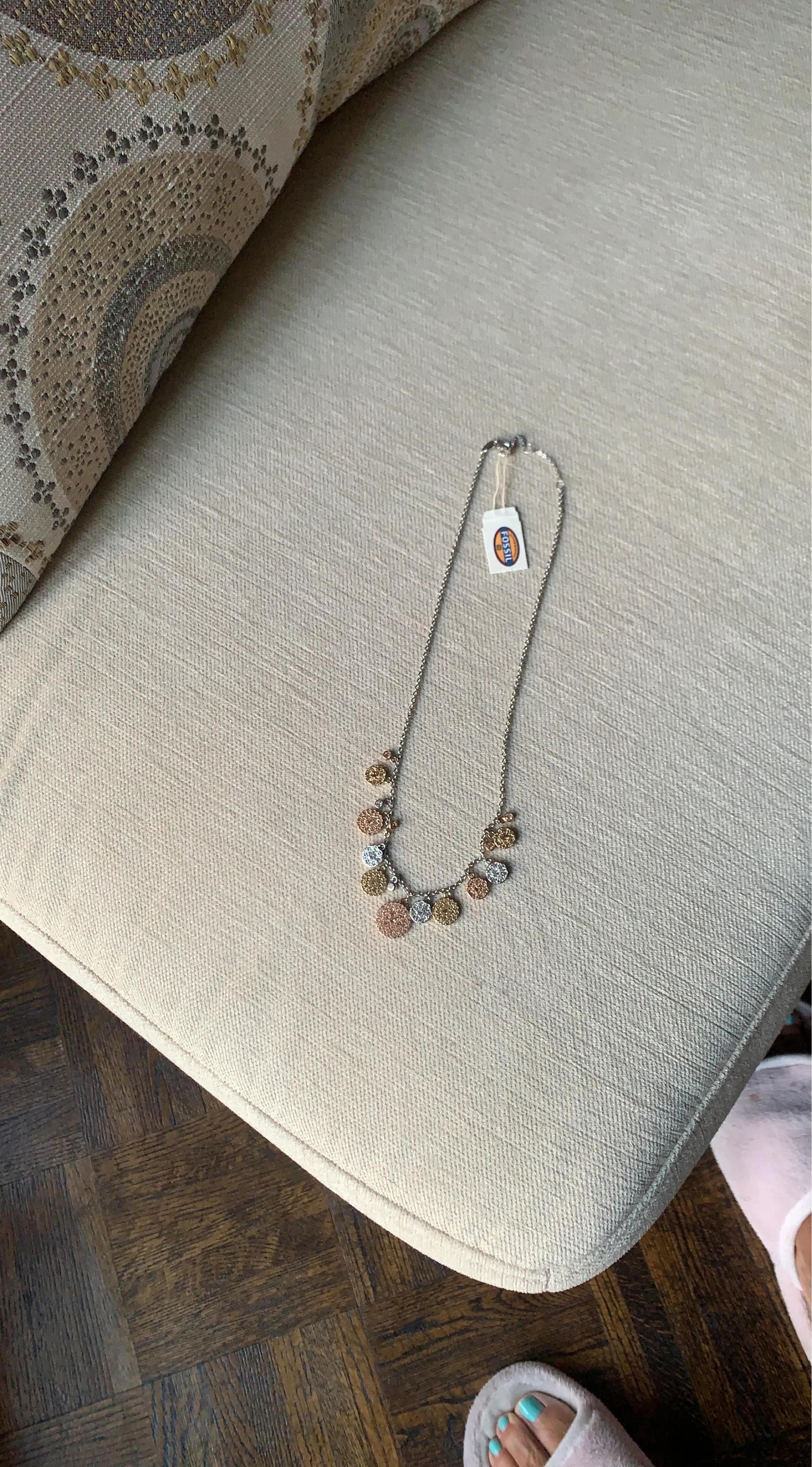 This Fossil necklace features a delicate silver-tone chain with an arrangement of sparkling disc-shaped charms. The charms are in a mix of gold, rose gold, and silver tones, some encrusted with clear crystals. It's a stylish accessory for everyday wear.
