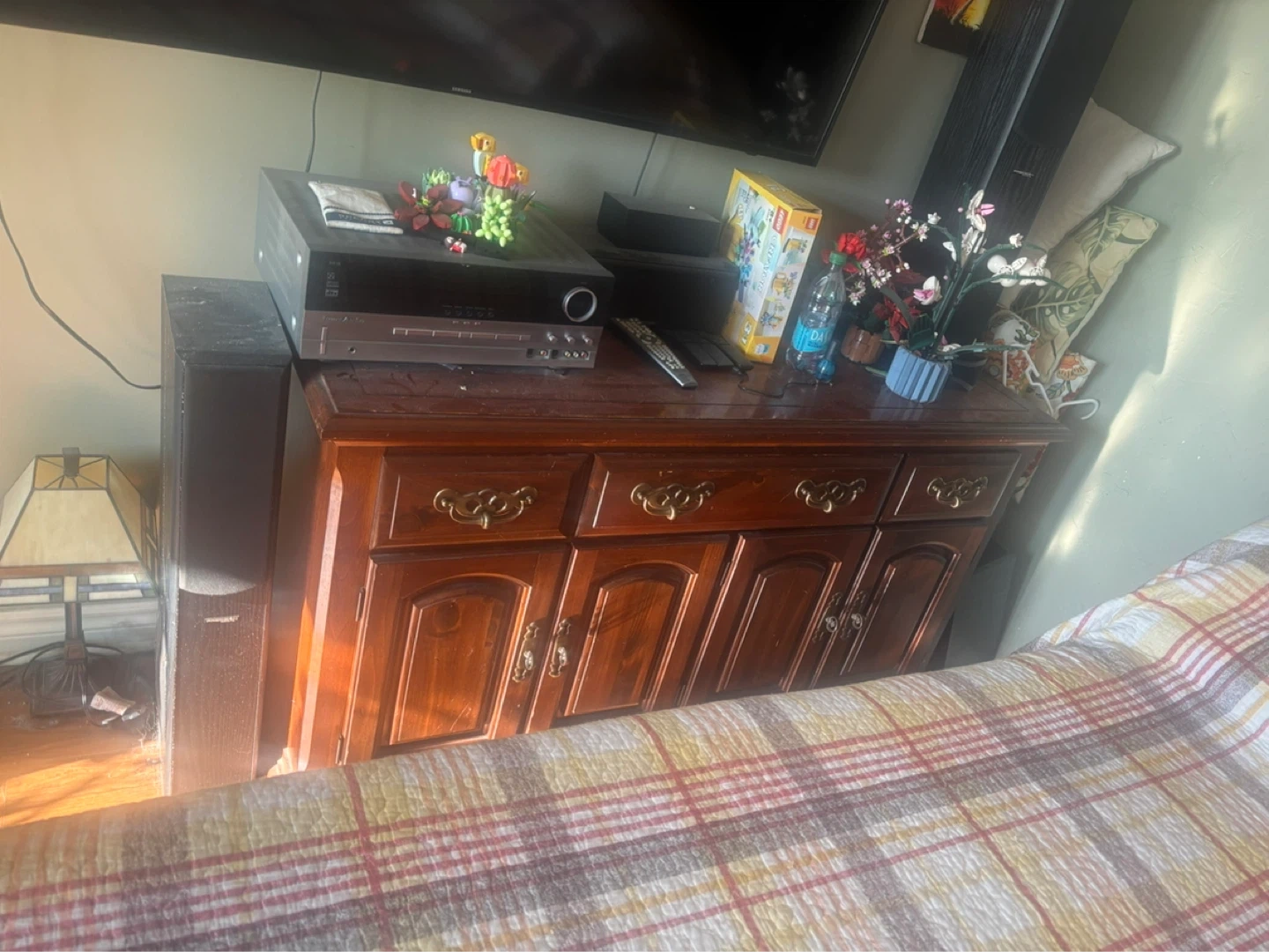 Beautiful wooden sideboard with ornate brass hardware. It features three drawers and four cabinet doors for ample storage. The rich wood finish adds warmth to any room.
