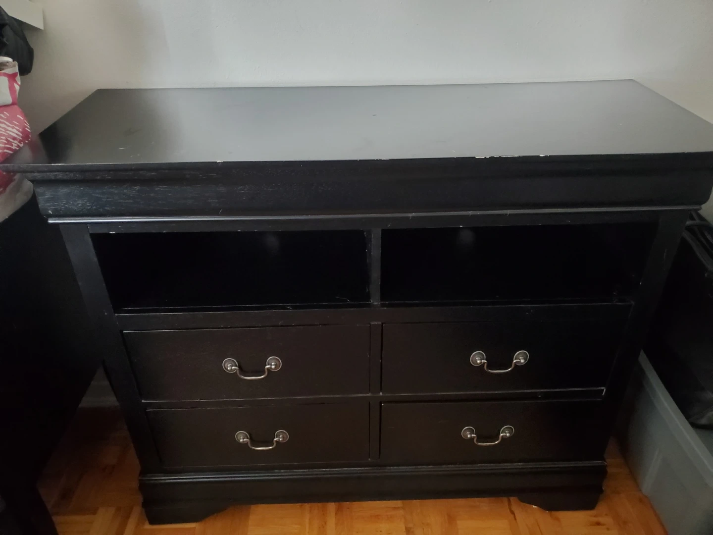 This is a black TV stand with four drawers and two open shelves. It's made of wood and has metal handles. It's a sturdy piece for your entertainment setup.