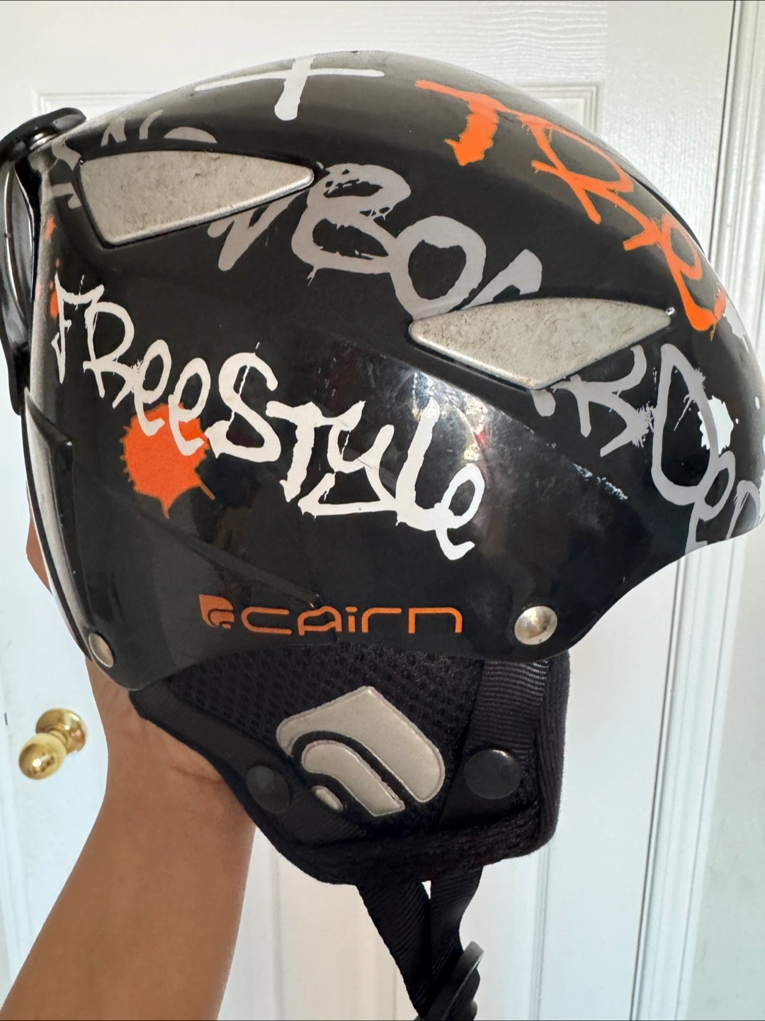 Selling a Cairn Skoll ski and snowboard helmet. It's a size small, fitting heads 51-53cm. The helmet features a freestyle design in black, orange, and white. Perfect for hitting the slopes!