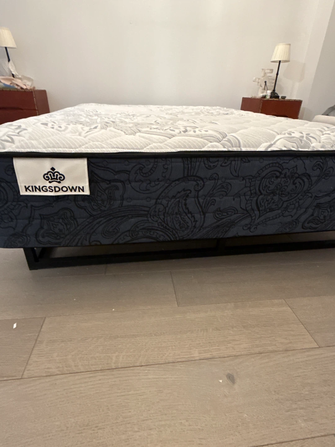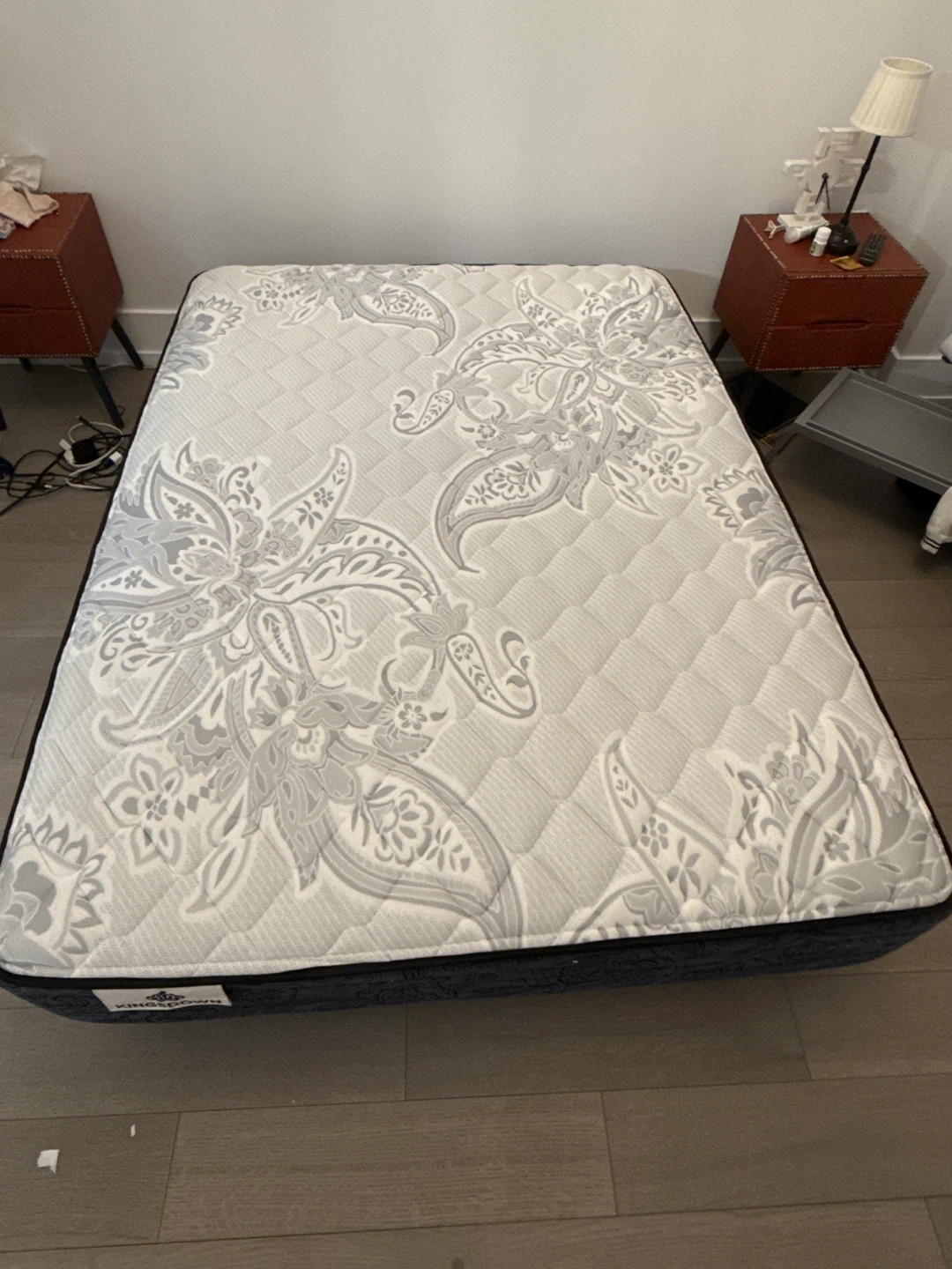 Kingdown mattress with a grey paisley design. It's a standard size. Provides a comfortable sleep surface.