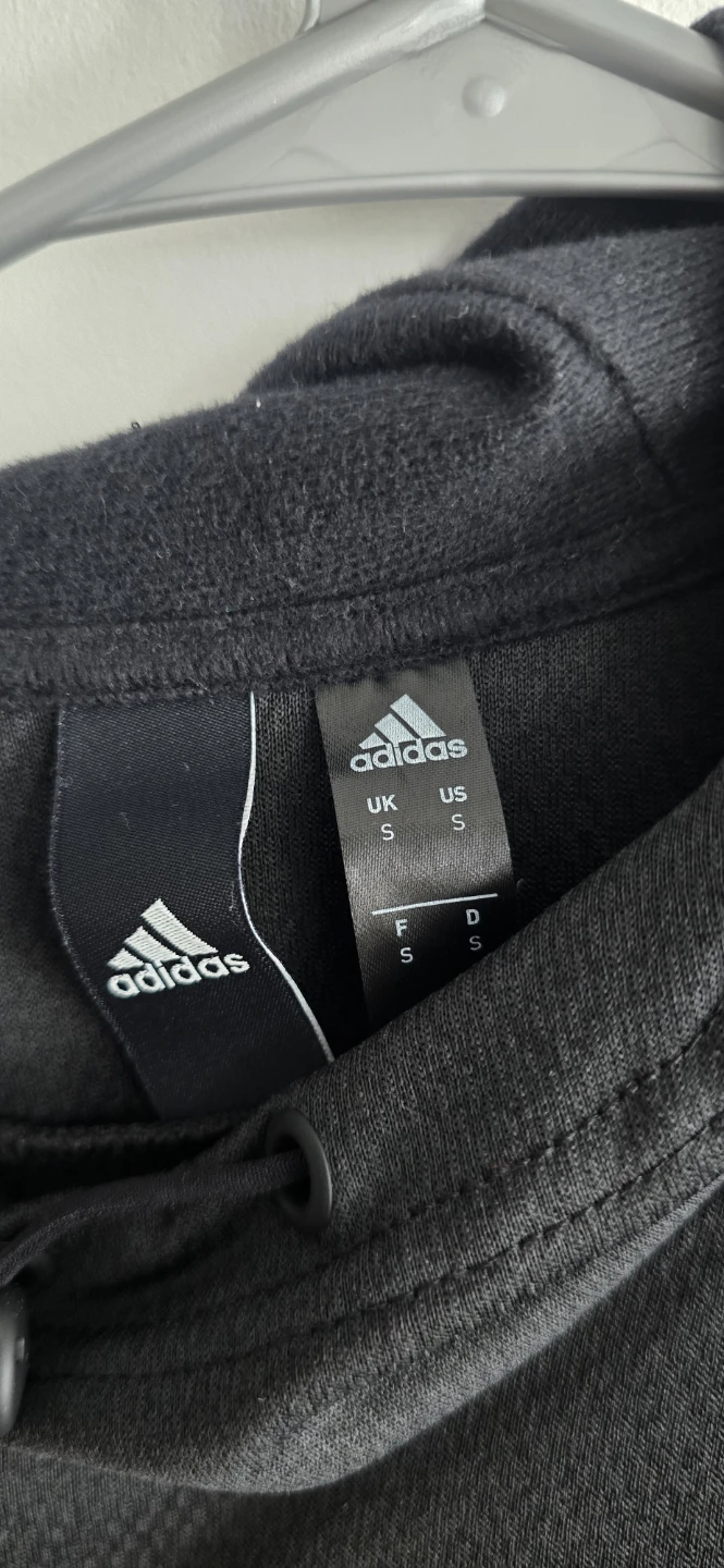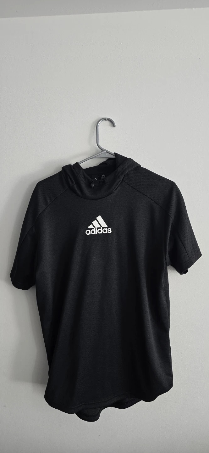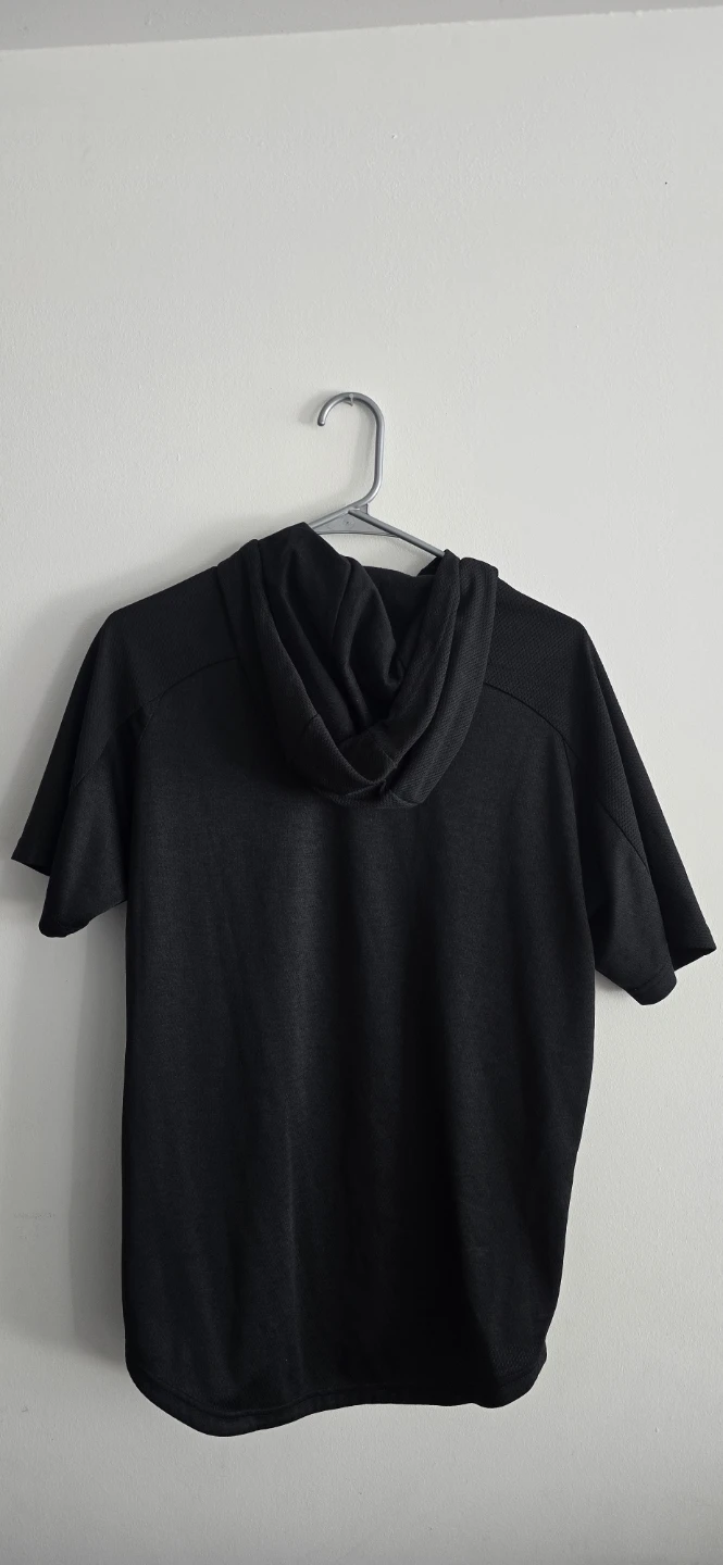 Black Adidas short sleeve hoodie. Size S. It's great for workouts or casual wear!