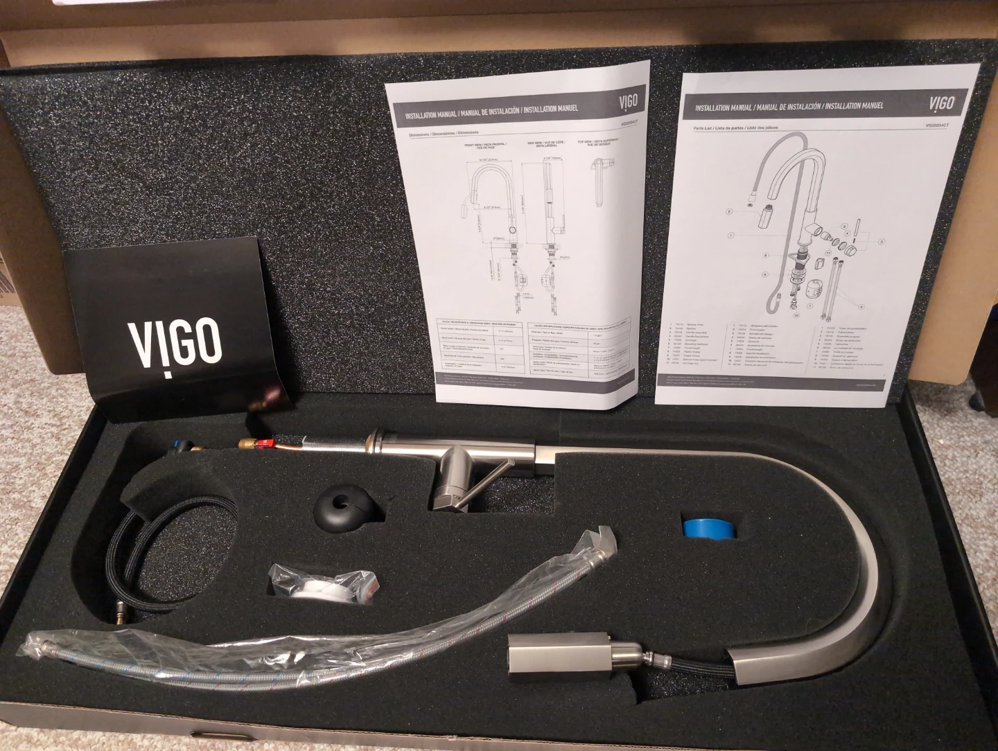 This VIGO kitchen faucet features a brushed stainless steel finish. It comes with an installation manual and all necessary parts for setup. It's a great addition for any kitchen renovation!