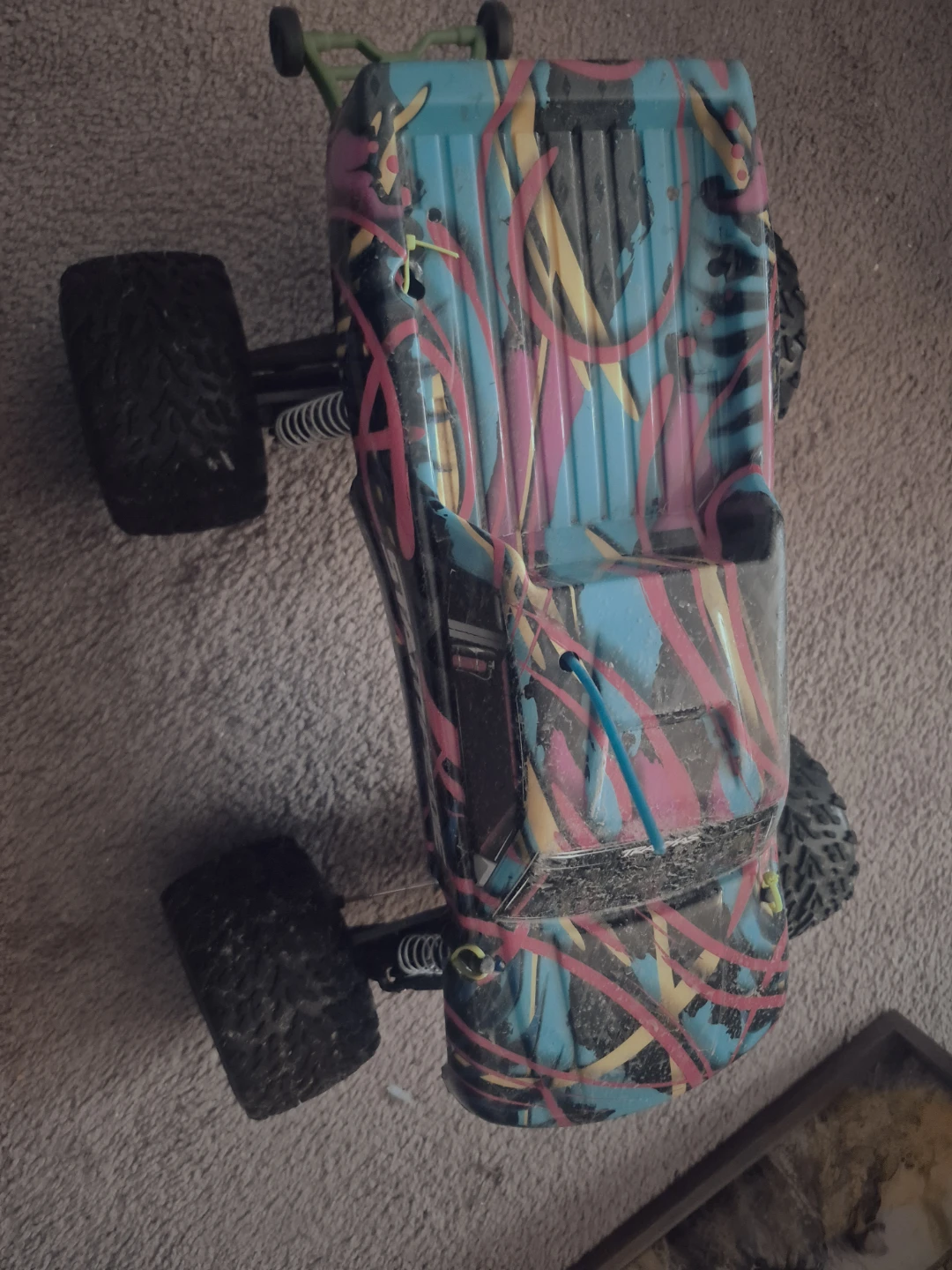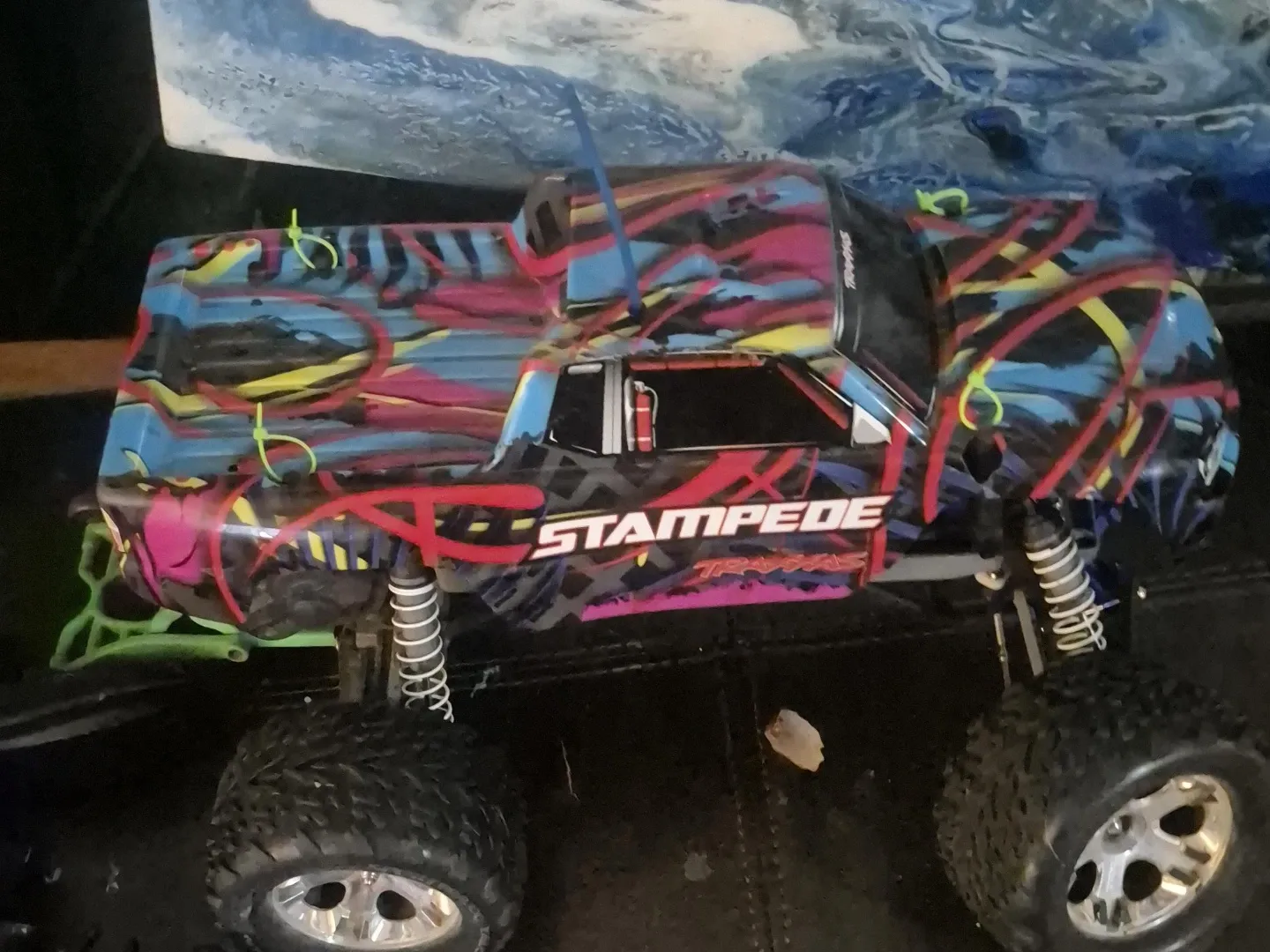 Traxxas Stampede remote control truck with a colourful graffiti-style body. It's a rugged vehicle designed for off-road fun. This RC truck features durable suspension and large tires for tackling various terrains.