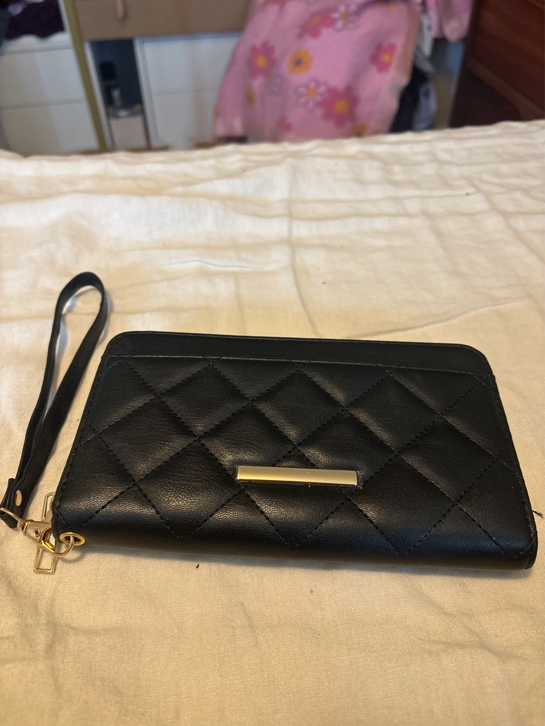 Black quilted wallet from Ardene with zip around closure and wrist strap. Pocket in front and inside. Bought for a funeral and only used once; in very good condition. DM if interested!