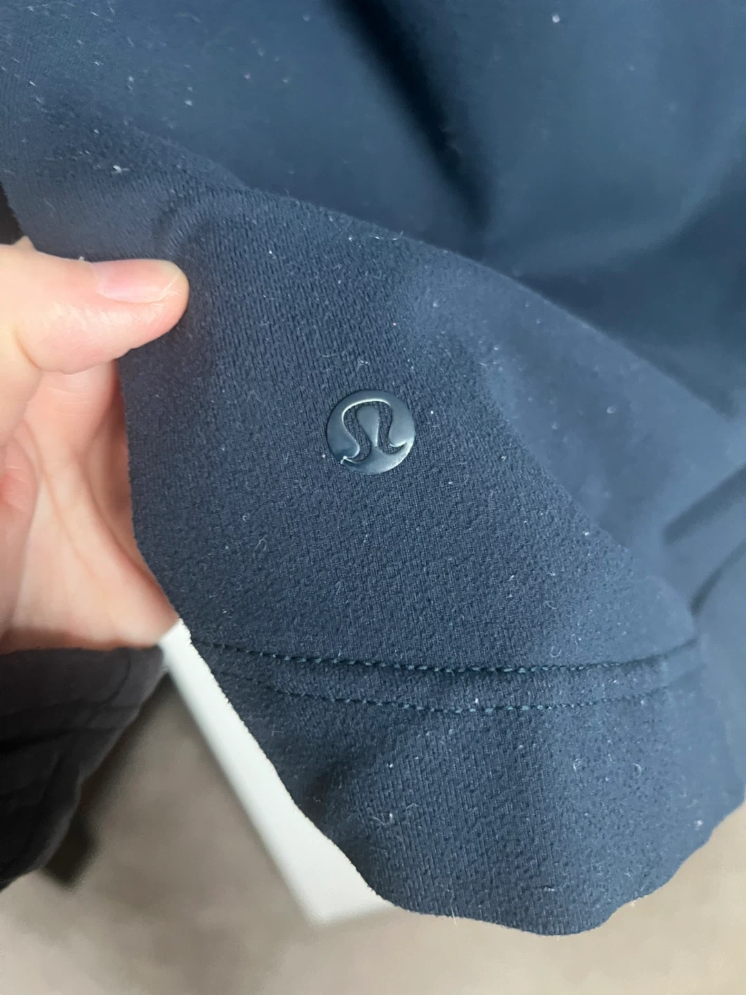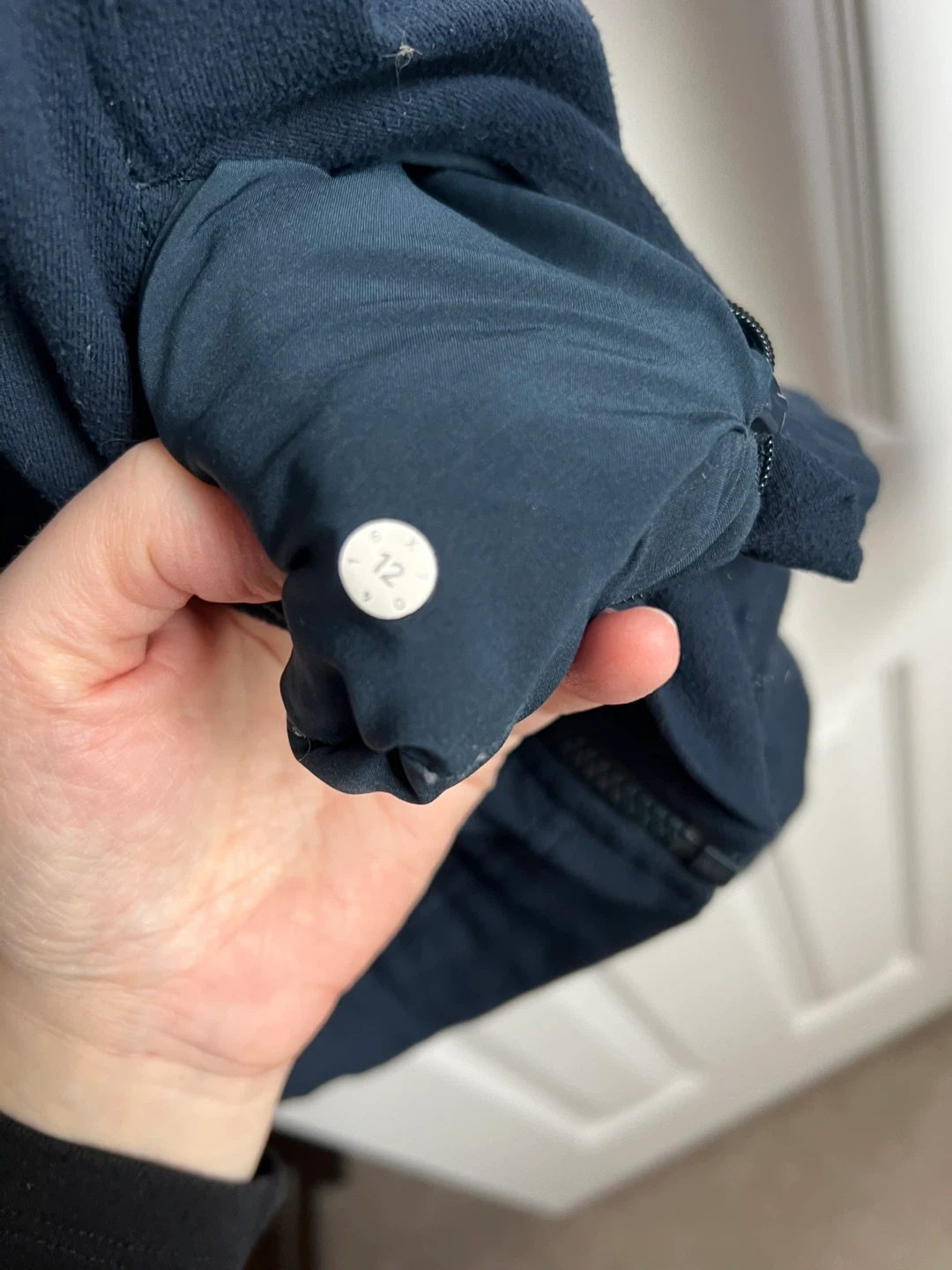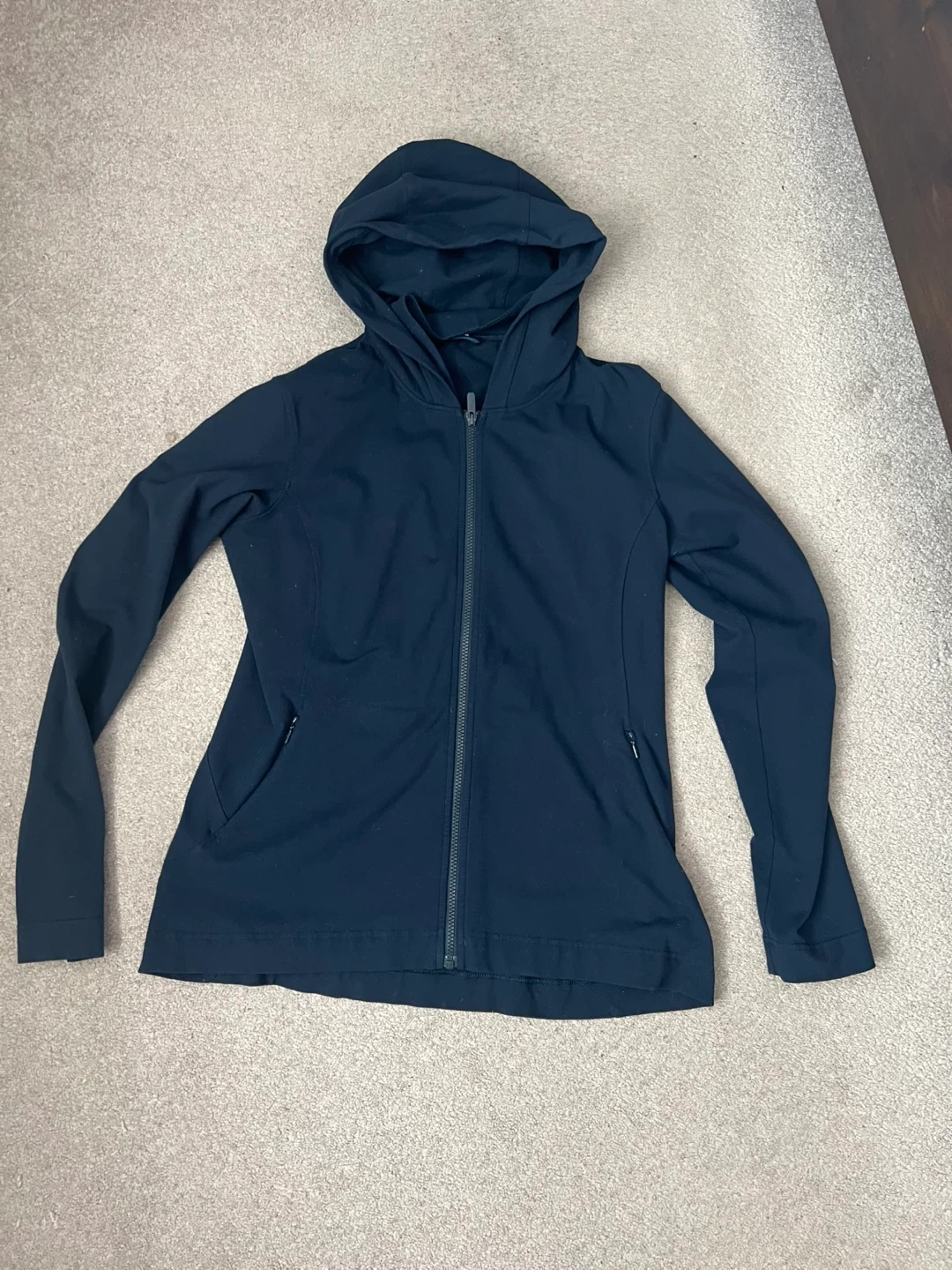This is a navy blue Lululemon hooded jacket. It features a full zip closure and two front pockets. Made with breathable fabric for comfort.