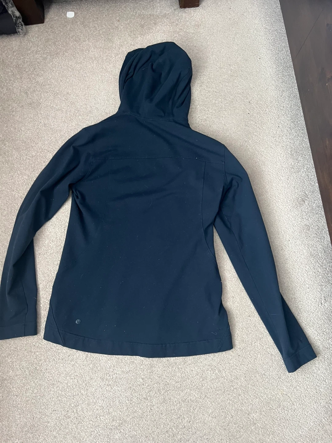 This is a navy blue Lululemon hooded jacket. It features a full zip closure and two front pockets. Made with breathable fabric for comfort.