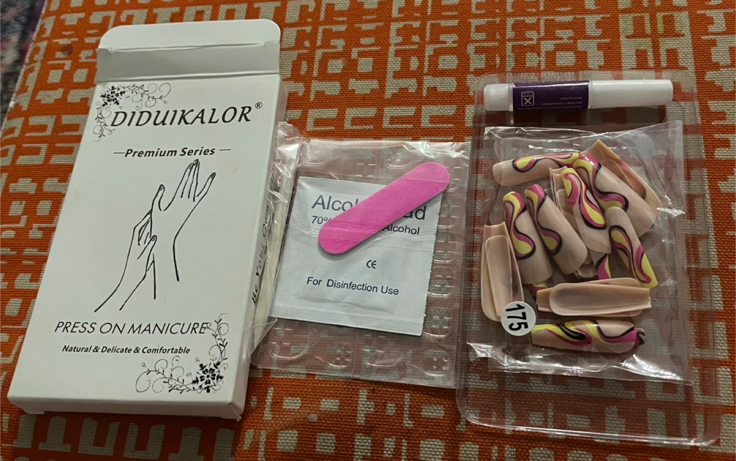 This DIDUIKALOR press-on manicure kit includes artificial nails and glue. It comes with an alcohol pad and a nail file for application. The set contains 24 press-on nails with a yellow French design.