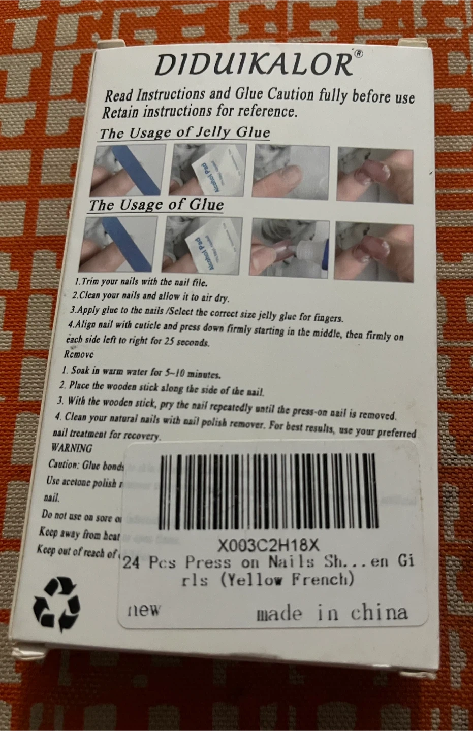 This DIDUIKALOR press-on manicure kit includes artificial nails and glue. It comes with an alcohol pad and a nail file for application. The set contains 24 press-on nails with a yellow French design.