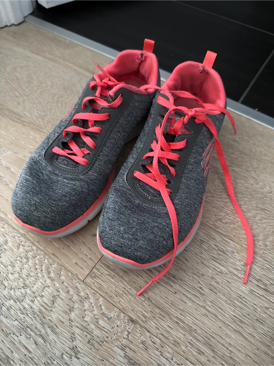 Comfortable Skechers women's athletic shoes in grey with coral accents. Textile upper and synthetic sole. These shoes feature memory foam for added comfort.