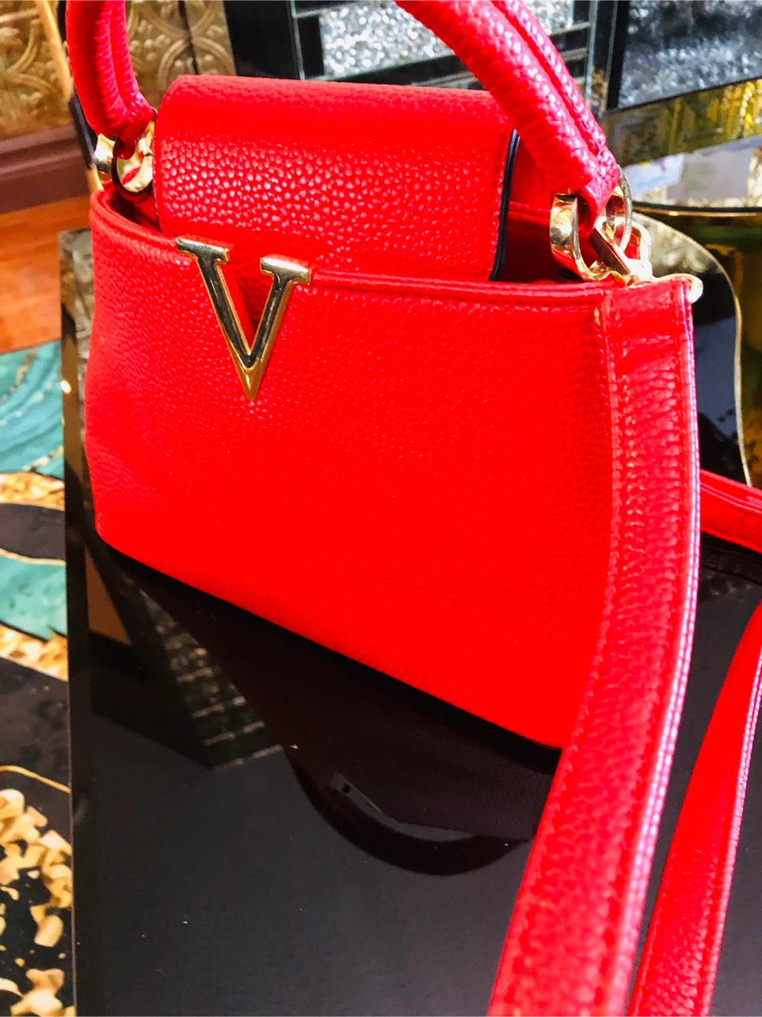 This red faux leather handbag has a pebbled texture and a gold V logo on the front flap. It includes a top handle and a detachable shoulder strap. A zippered pocket is on the back.