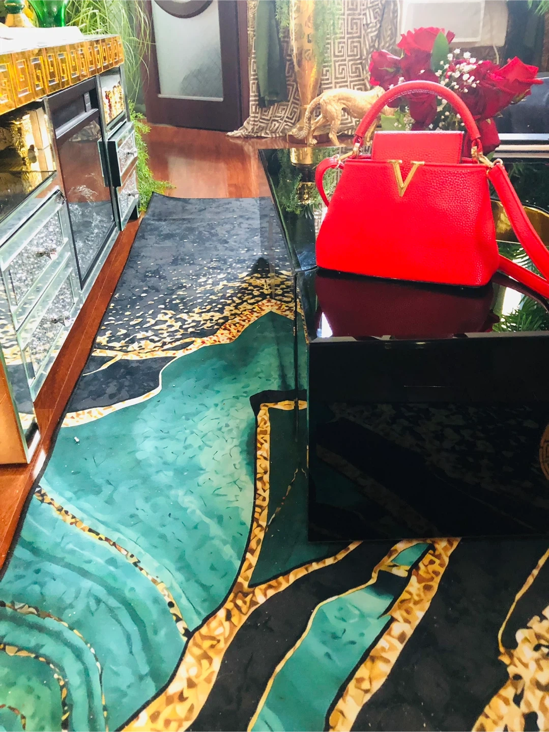 Red Faux Leather Handbag with Gold V Detail