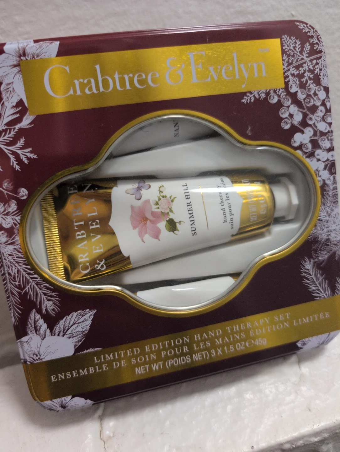 This is a Crabtree & Evelyn Limited Edition Hand Therapy Set. It includes three 1.5 oz (45g) tubes. The set is designed for hand care.