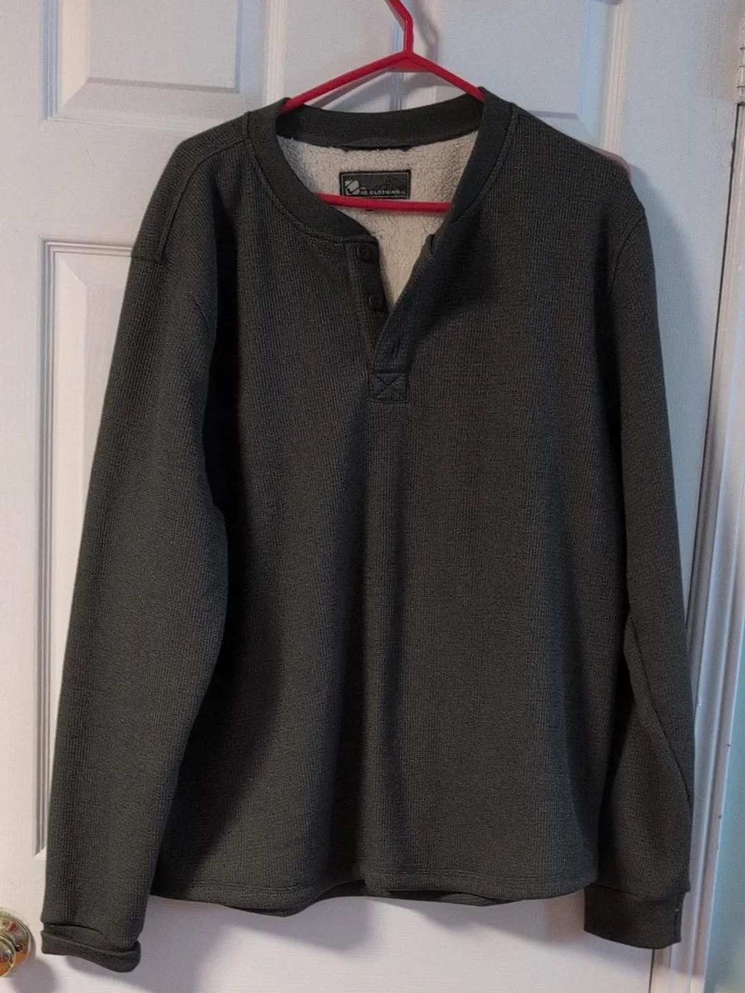 Dark grey long-sleeve henley shirt with a sherpa lining for warmth. Features a three-button placket. Material is a waffle knit.