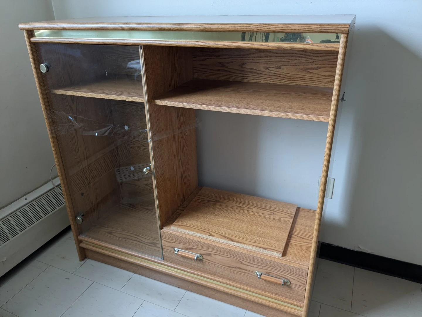 Oak entertainment unit featuring glass-fronted cabinets and two drawers. It has multiple shelves for media storage. Made of wood material.