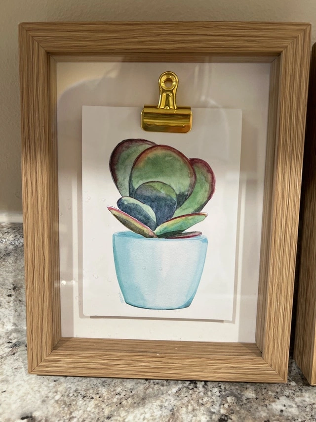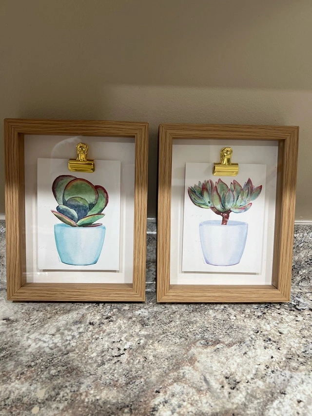 Add a touch of greenery to your walls with this pair of framed succulent prints! These charming pieces each feature a unique succulent illustration, bringing a bit of the outdoors inside. The light wood frames and golden clips add a modern, stylish touch. They have been previously displayed and are in good condition. Ready to give your space a little refresh?