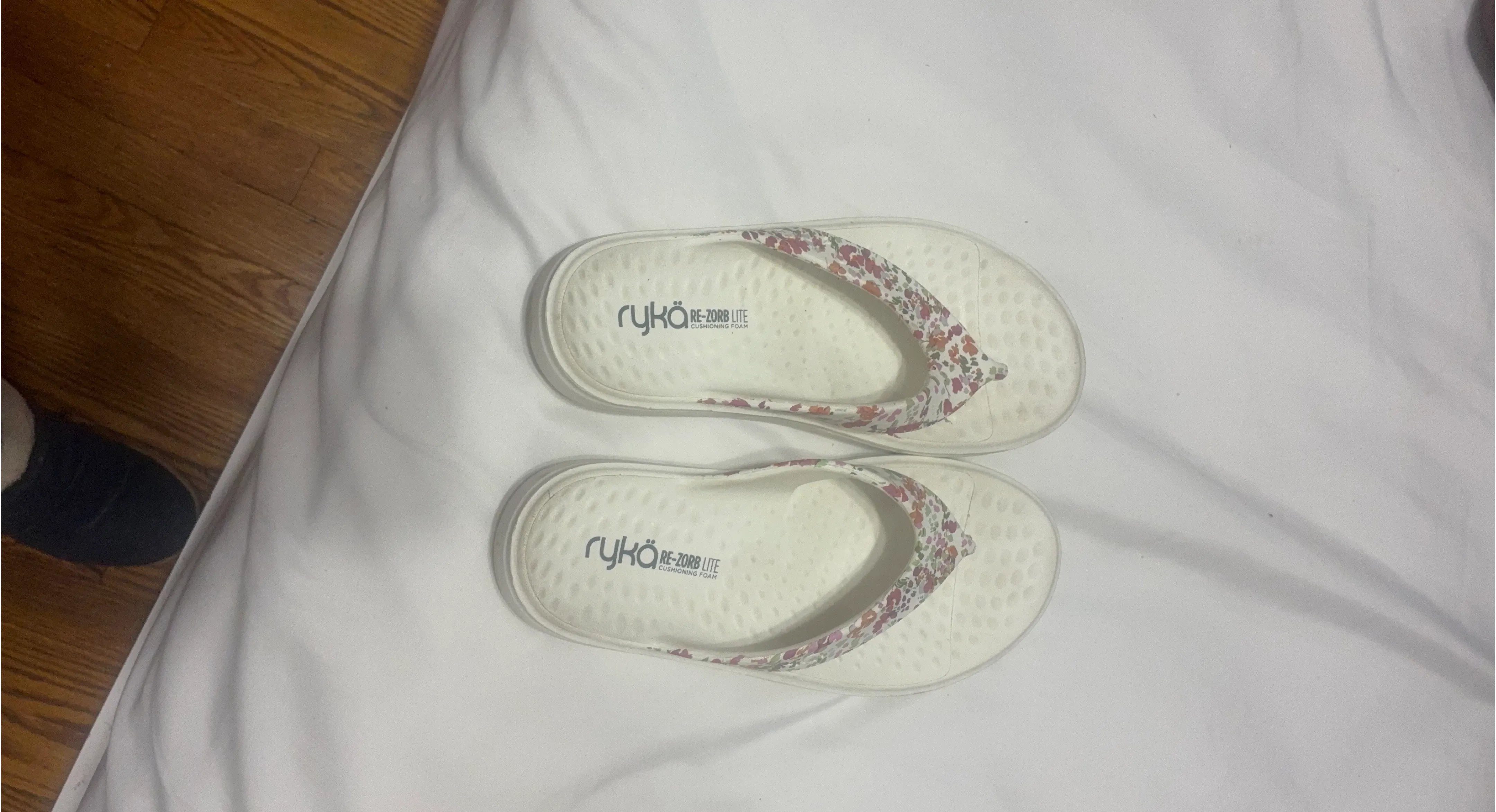 Selling a pair of Ryka RE-ZORB Lite flip flops! They have a cute floral pattern on the straps and feature RE-ZORB Lite cushioning foam for extra comfort