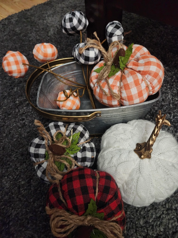 Here's a cute set of fall-themed decorative pumpkins and a galvanized basket! The pumpkins come in various patterns made from material, including buffalo plaid and knitted designs. They'd be perfect for adding a cozy touch to your autumn decor.