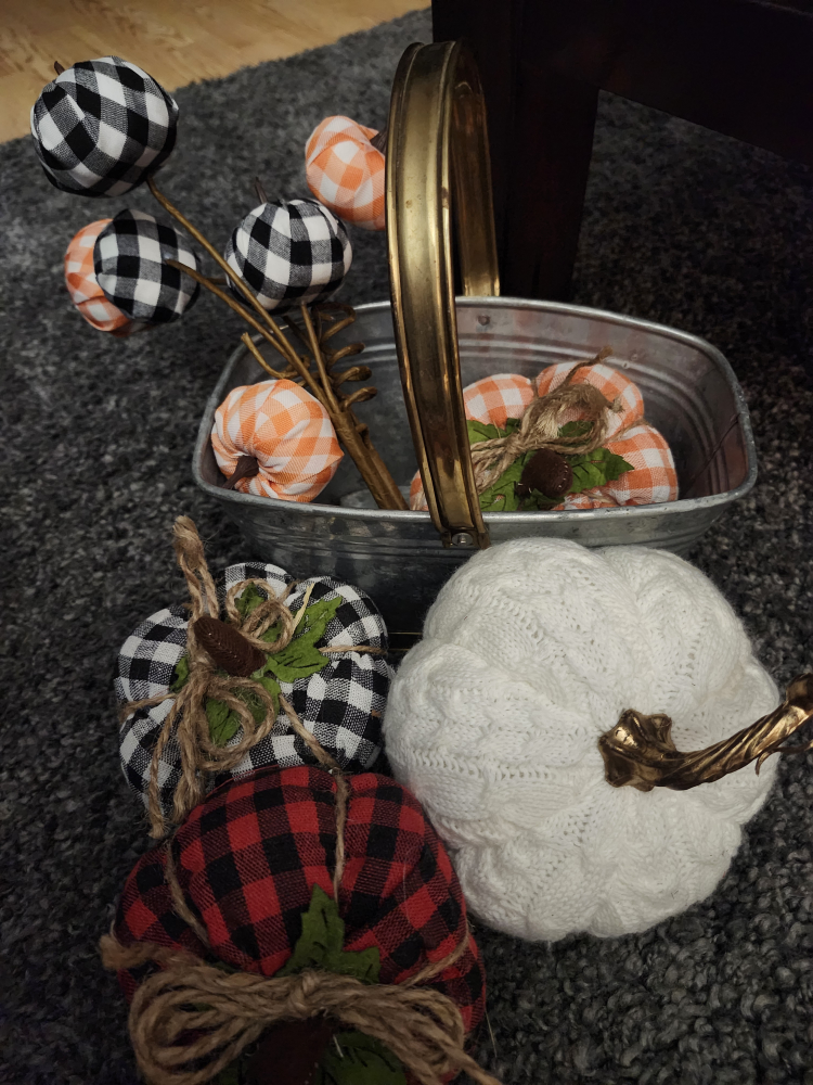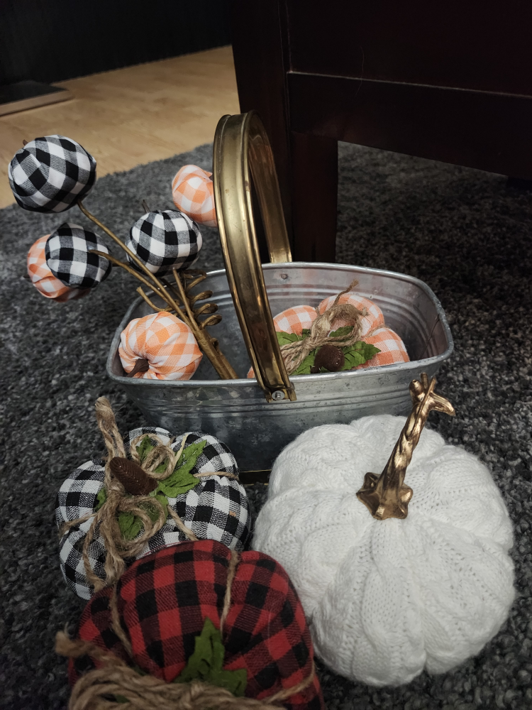 Here's a cute set of fall-themed decorative pumpkins and a galvanized basket! The pumpkins come in various patterns made from material, including buffalo plaid and knitted designs. They'd be perfect for adding a cozy touch to your autumn decor.