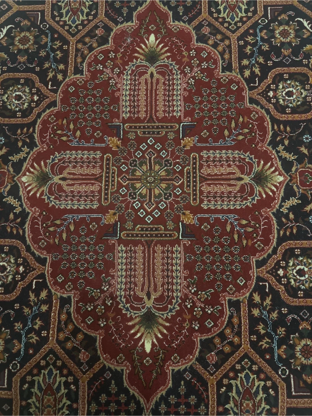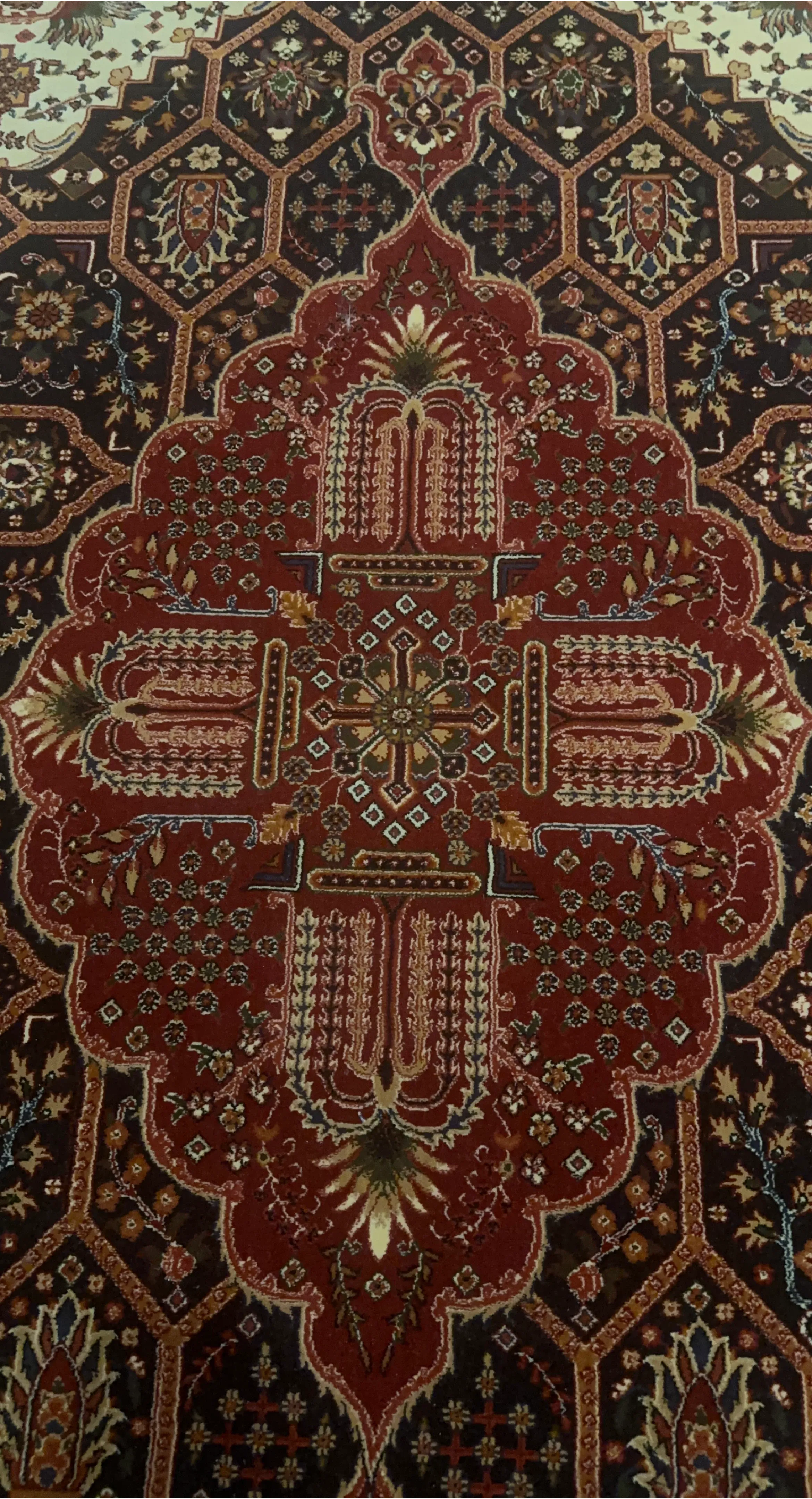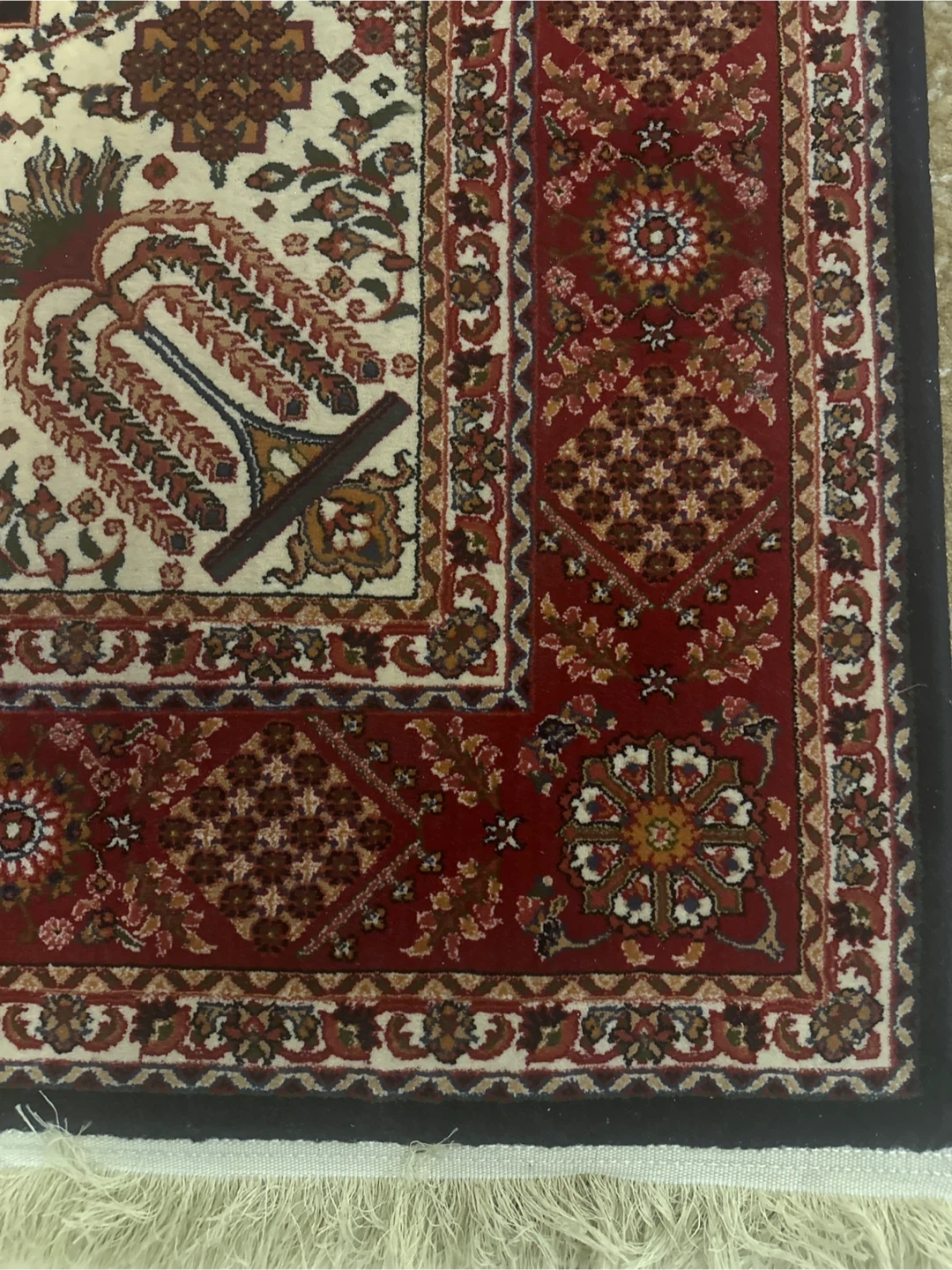 This is a beautiful luxury area rug with a traditional Persian design. It features intricate patterns in rich colours like deep red, navy, and cream. It's made of durable material and would add elegance to any room. 700 Reeds, 2100 Picks. Grade 1 Made in Iran.