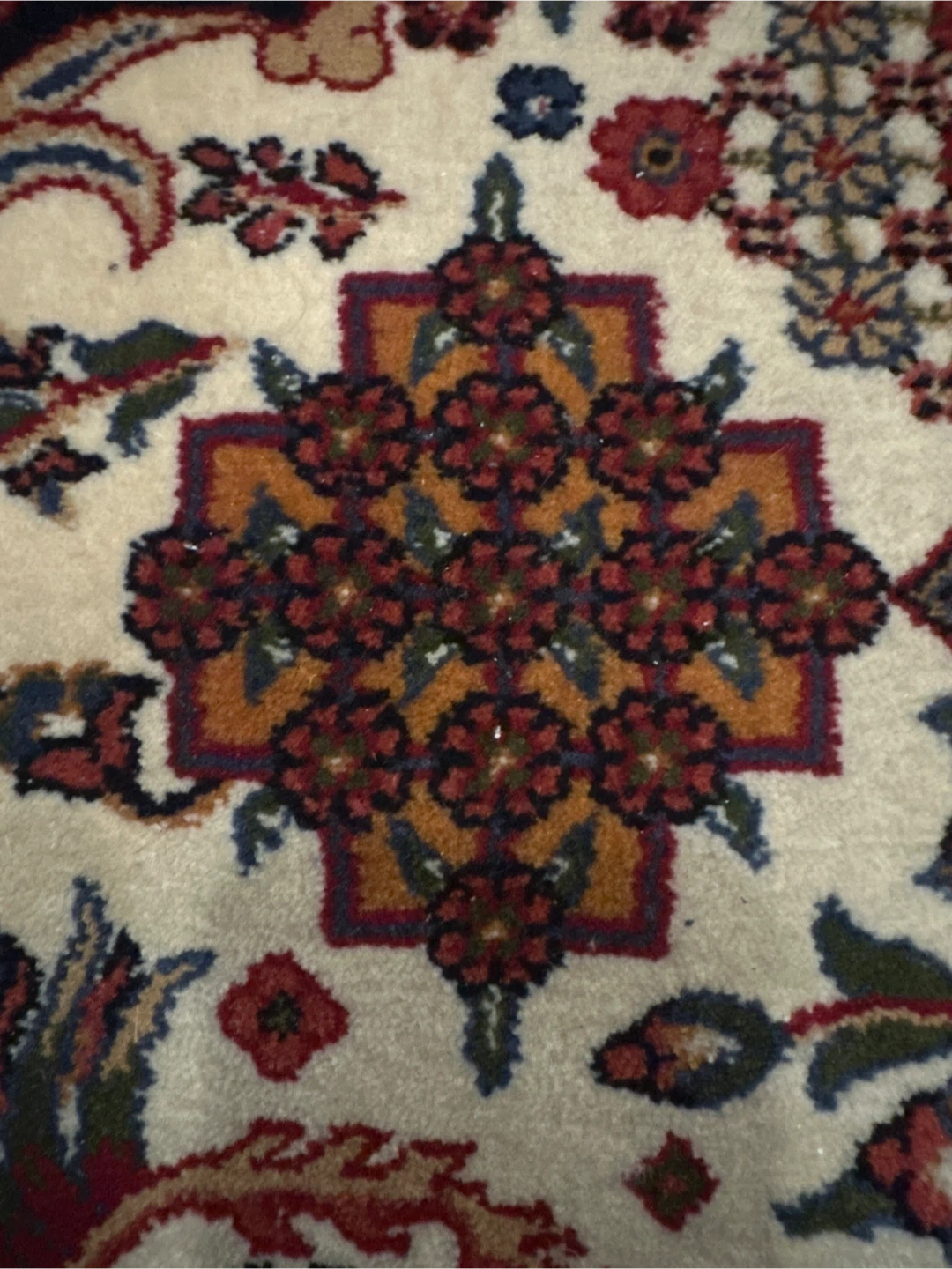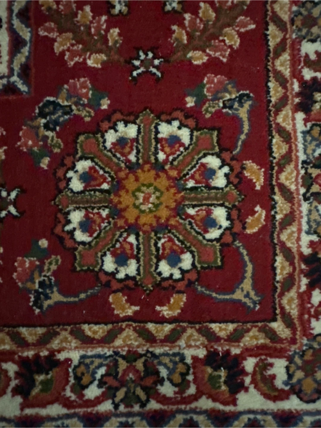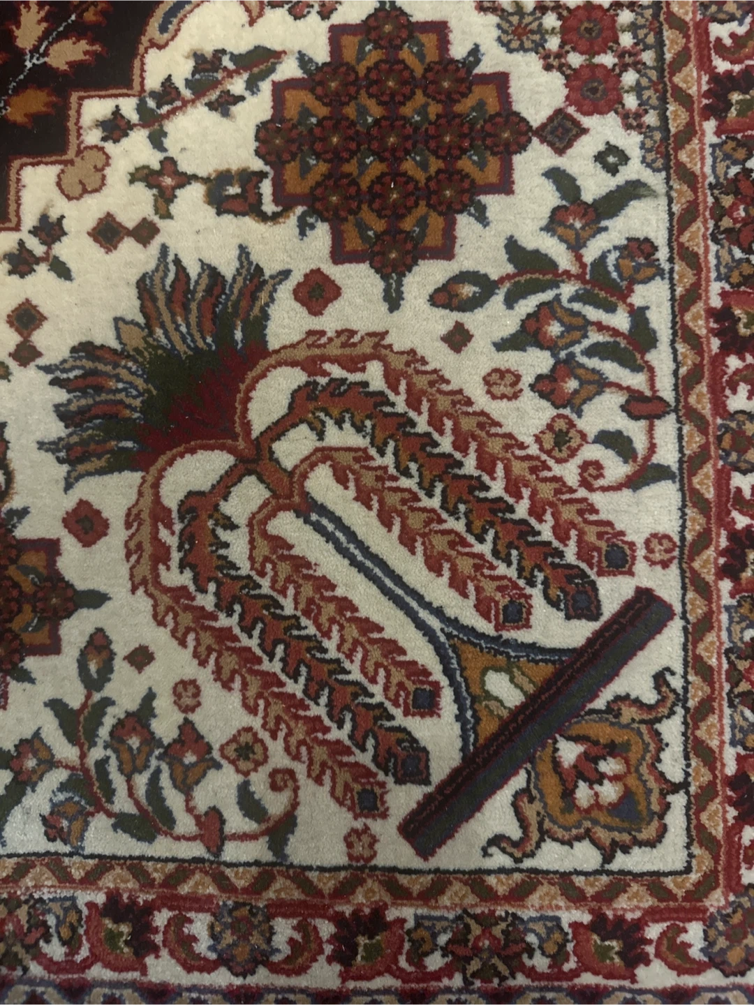 This is a beautiful luxury area rug with a traditional Persian design. It features intricate patterns in rich colours like deep red, navy, and cream. It's made of durable material and would add elegance to any room. 700 Reeds, 2100 Picks. Grade 1 Made in Iran.