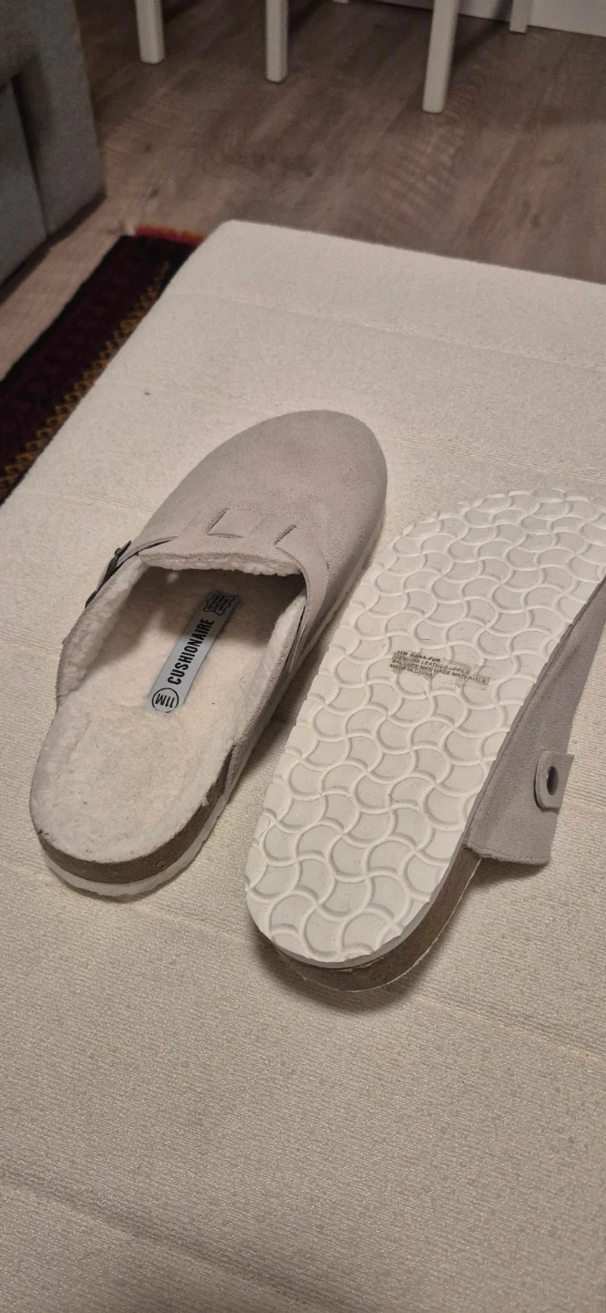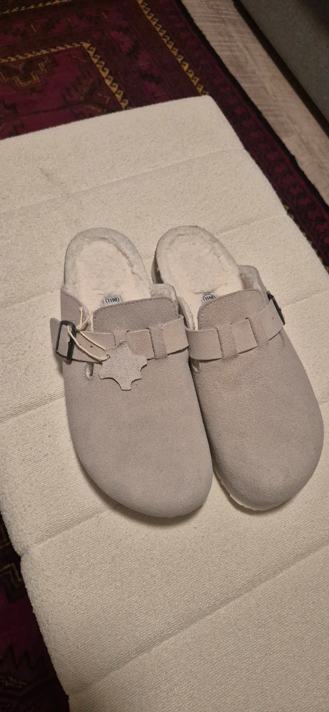 Cozy Birkenstock dupe clogs in a light grey suede. They're lined with warm shearling for comfort. Brand new and never worn