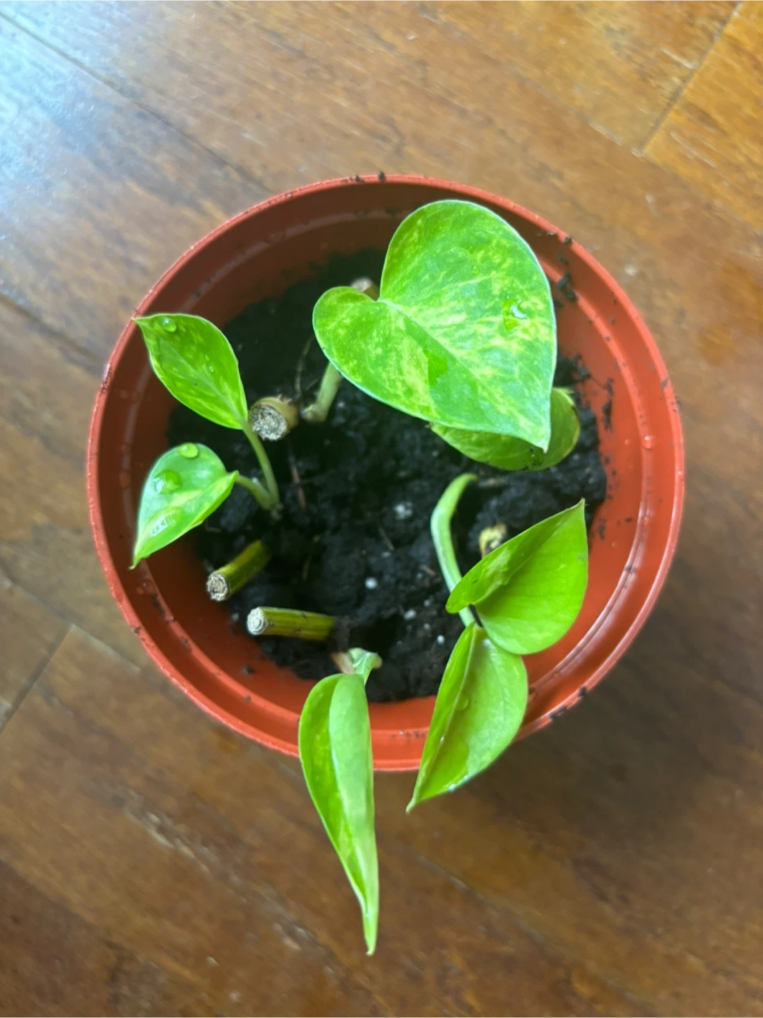 These are healthy Pothos plant cuttings ready for propagation. They're in a small terracotta pot with soil. Each cutting has at least one leaf and a node. This is a great starter for anyone wanting to grow their own Pothos plant!