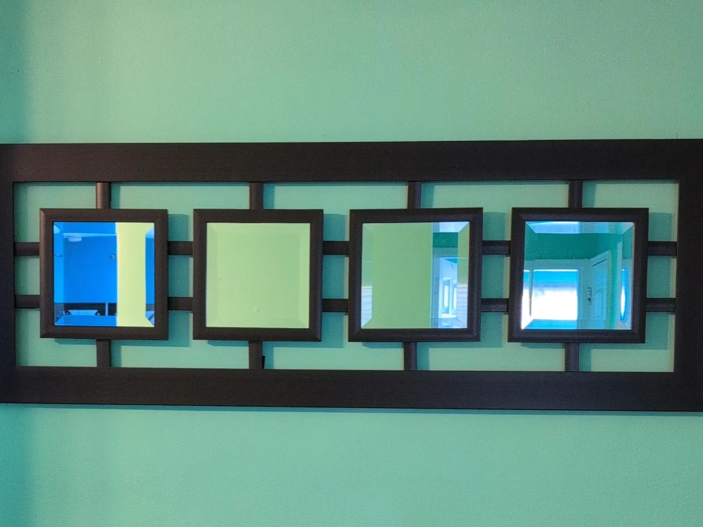Selling a square mirror wall decor piece. It features a black frame with four square mirrors. Great for adding a touch of modern style to any room!