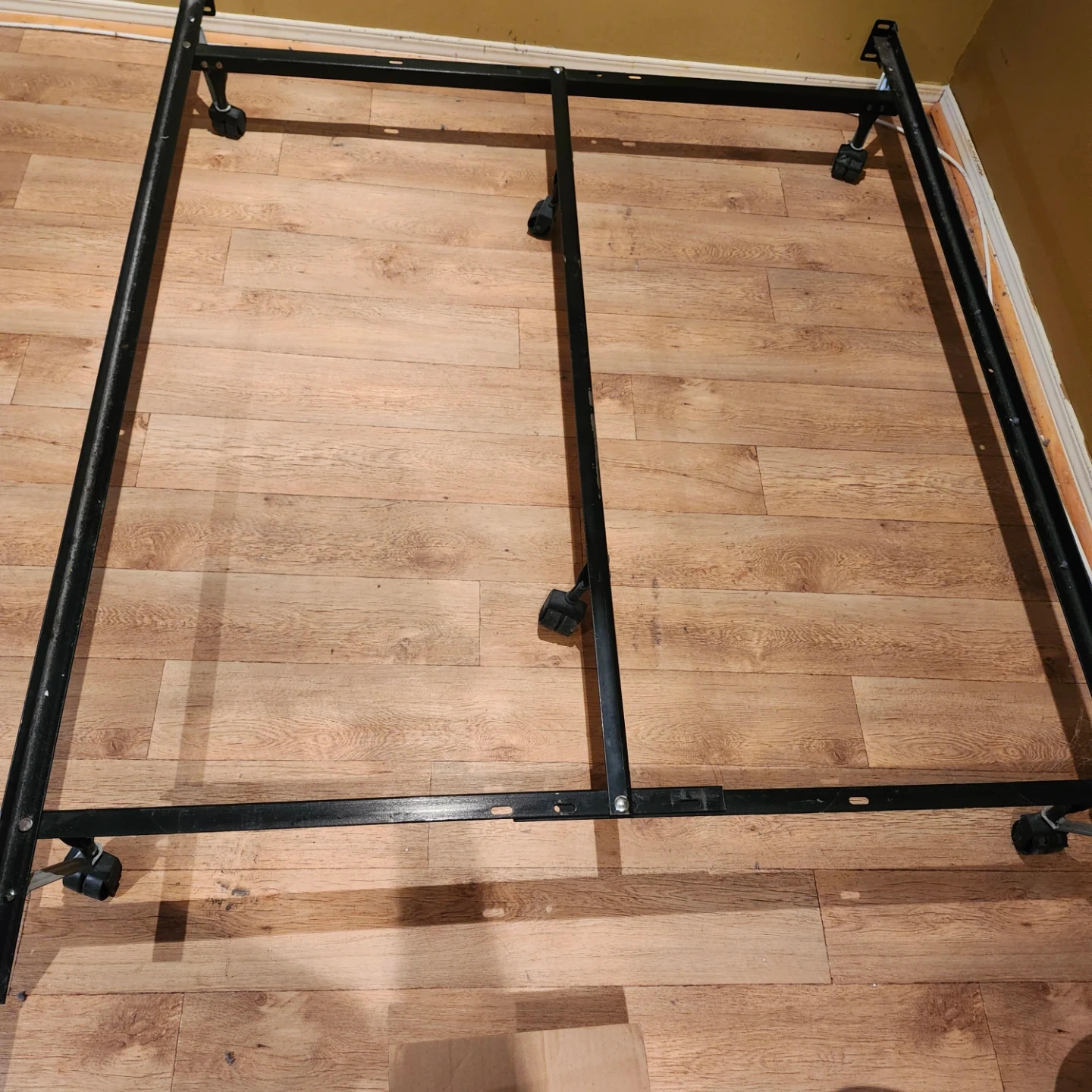 Queen/Double. This is a metal bed frame with wheels, designed for durability. It's a sturdy base for your mattress. It has a black finish and includes casters for easy movement.