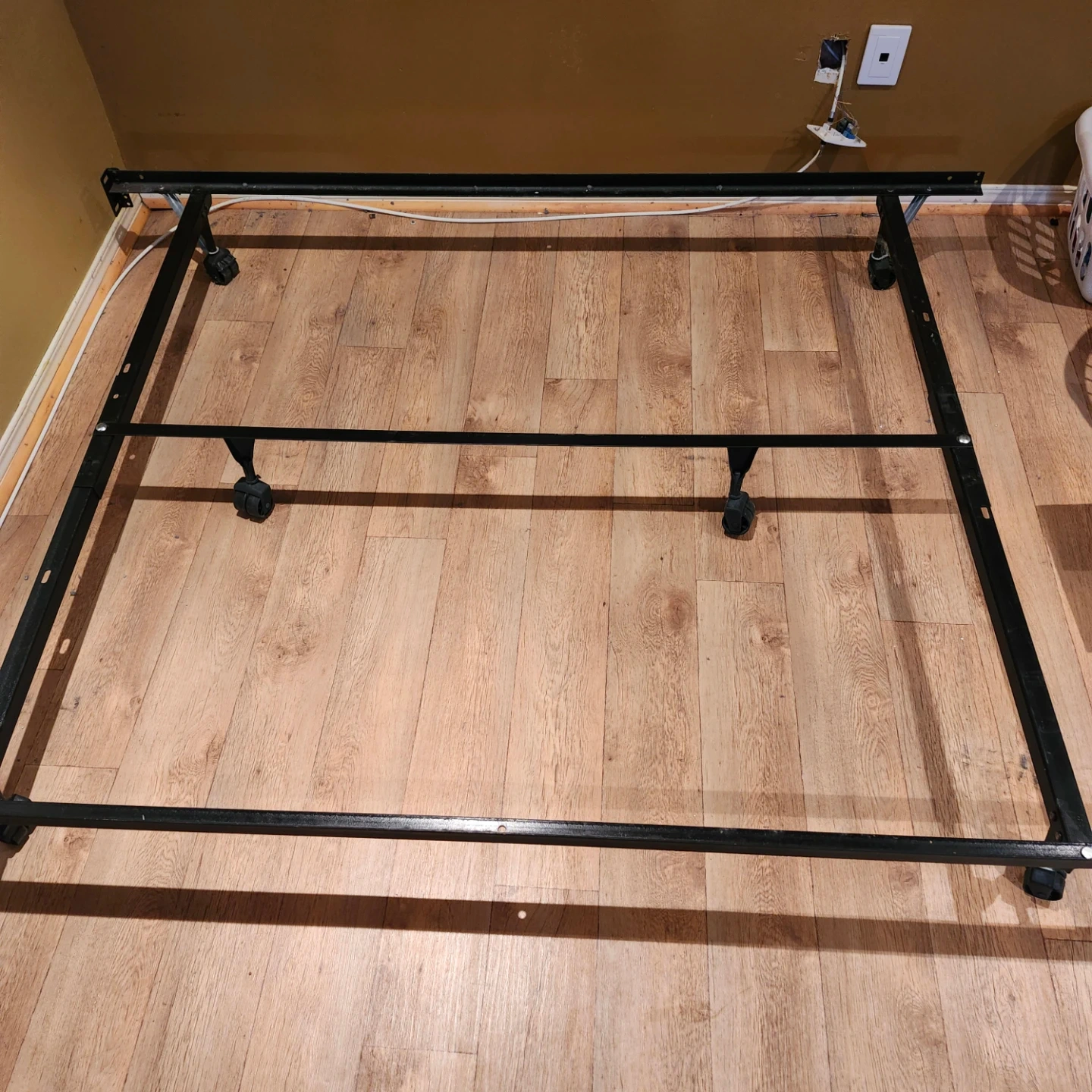 Queen/Double. This is a metal bed frame with wheels, designed for durability. It's a sturdy base for your mattress. It has a black finish and includes casters for easy movement.