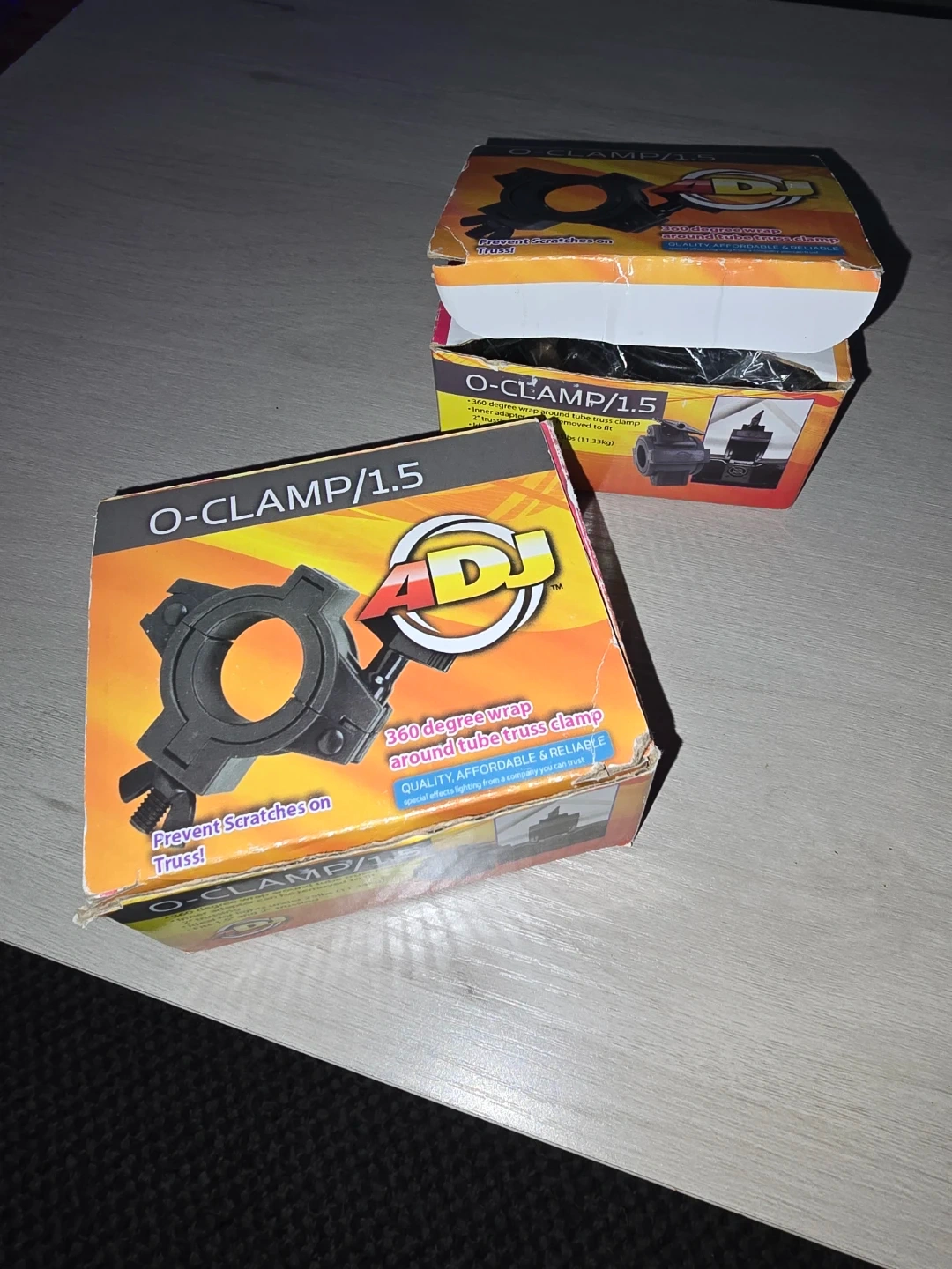 This is an ADJ O-CLAMP/1.5 truss clamp. It offers a 360-degree wrap around tube truss clamp. It's designed to prevent scratches on truss. Used for Dj Equipment and Lighting
