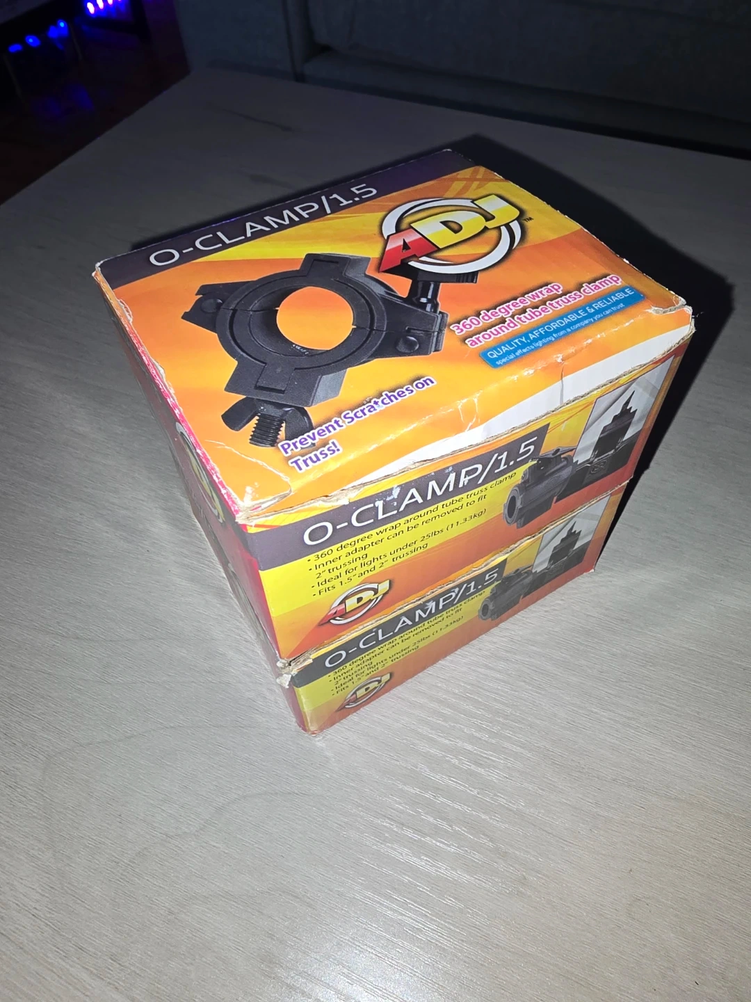 This is an ADJ O-CLAMP/1.5 truss clamp. It offers a 360-degree wrap around tube truss clamp. It's designed to prevent scratches on truss. Used for Dj Equipment and Lighting
