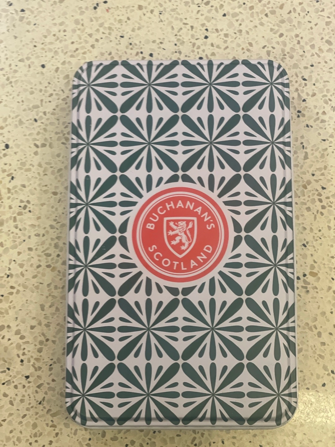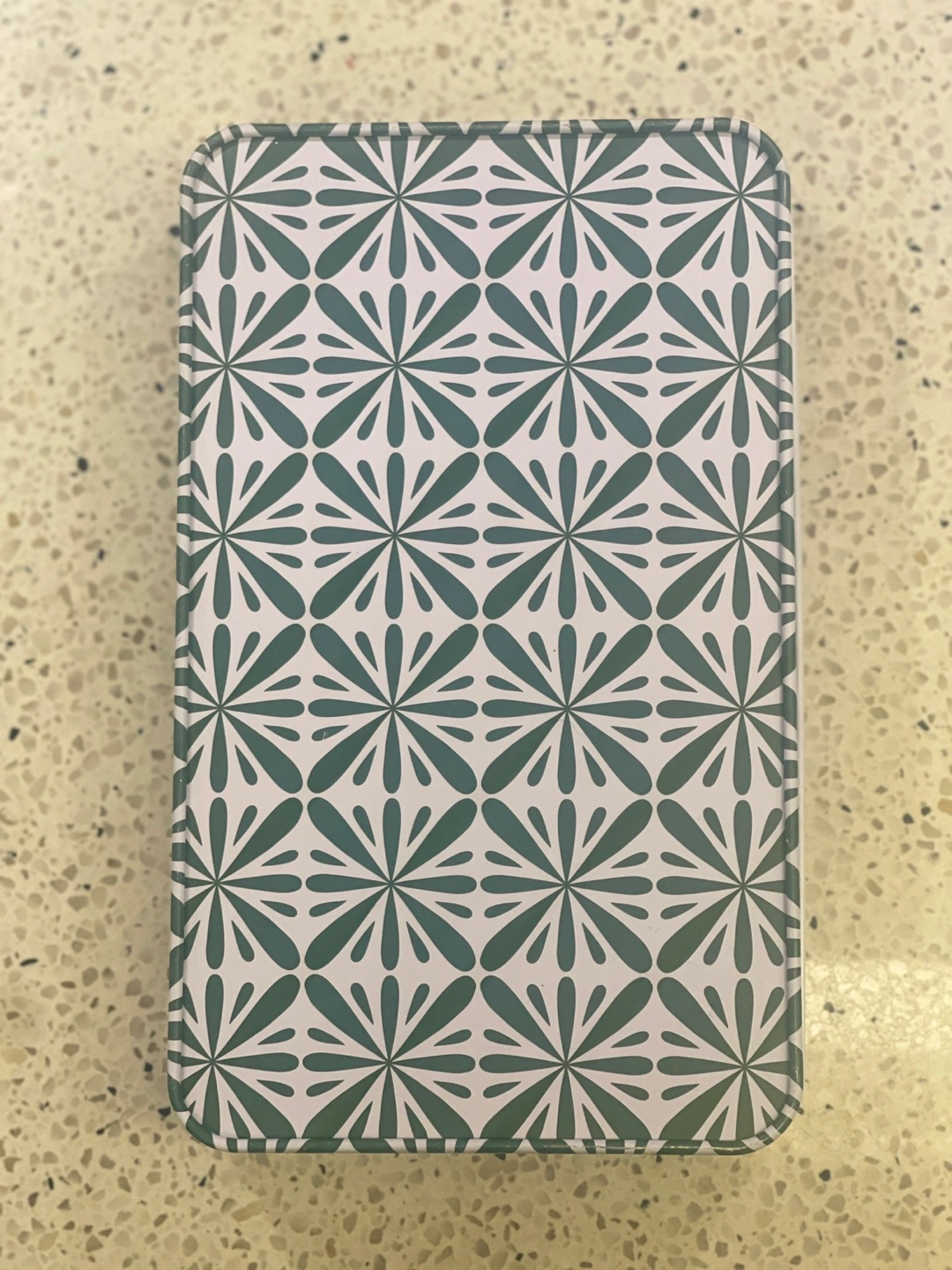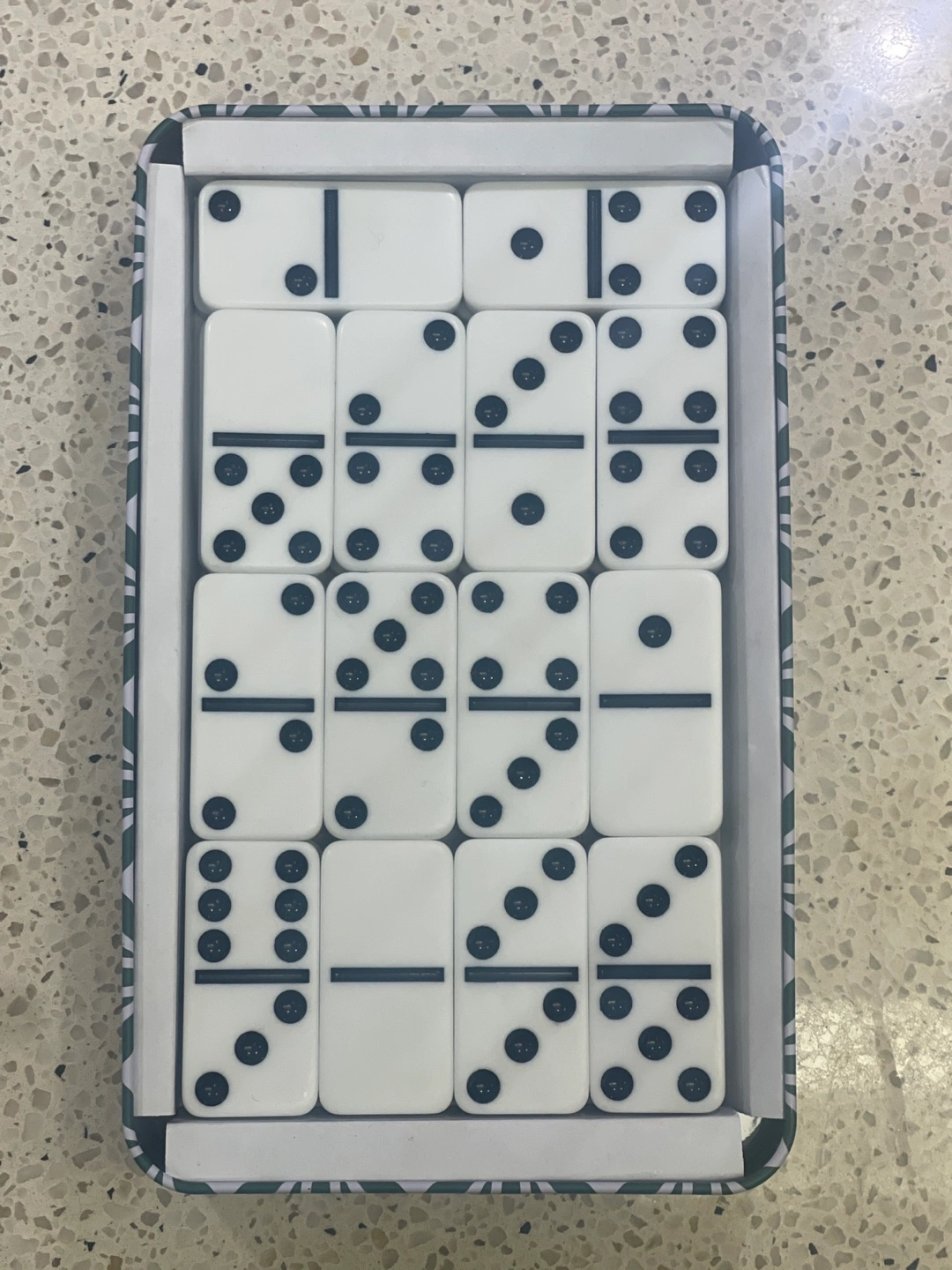 Double-six dominoes in a collectible tin. Green and white floral design. Perfect gift or addition to game collection.