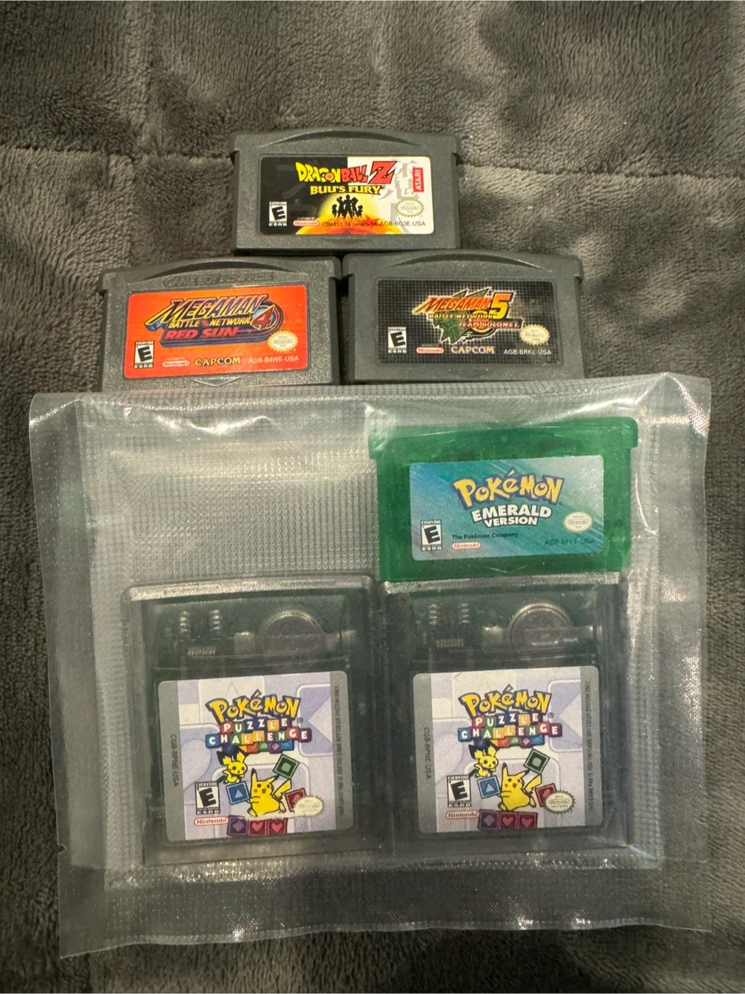 Gameboy game lot includes Pokemon emerald and 2 copies of puzzle challenge , dragon ball z buu’s fury and megaman 4&5