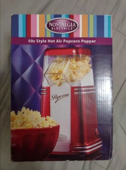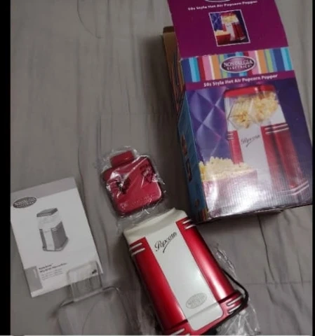 Red and white popcorn popper. Includes instruction manual, lid, and power cord.