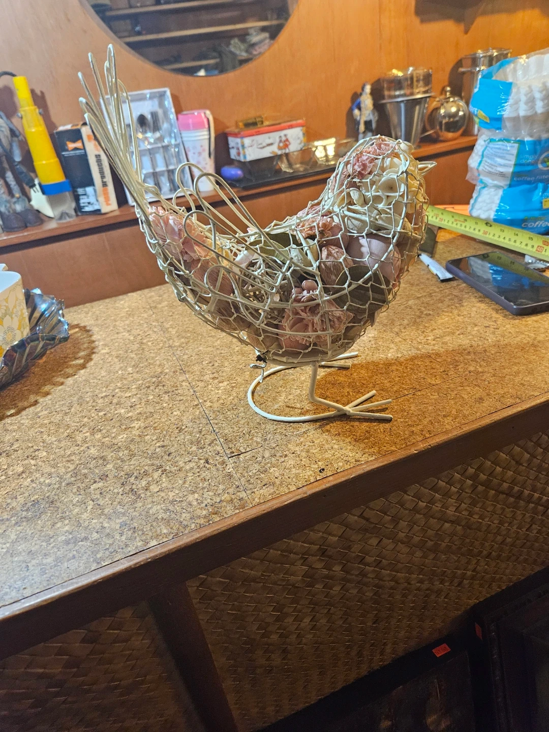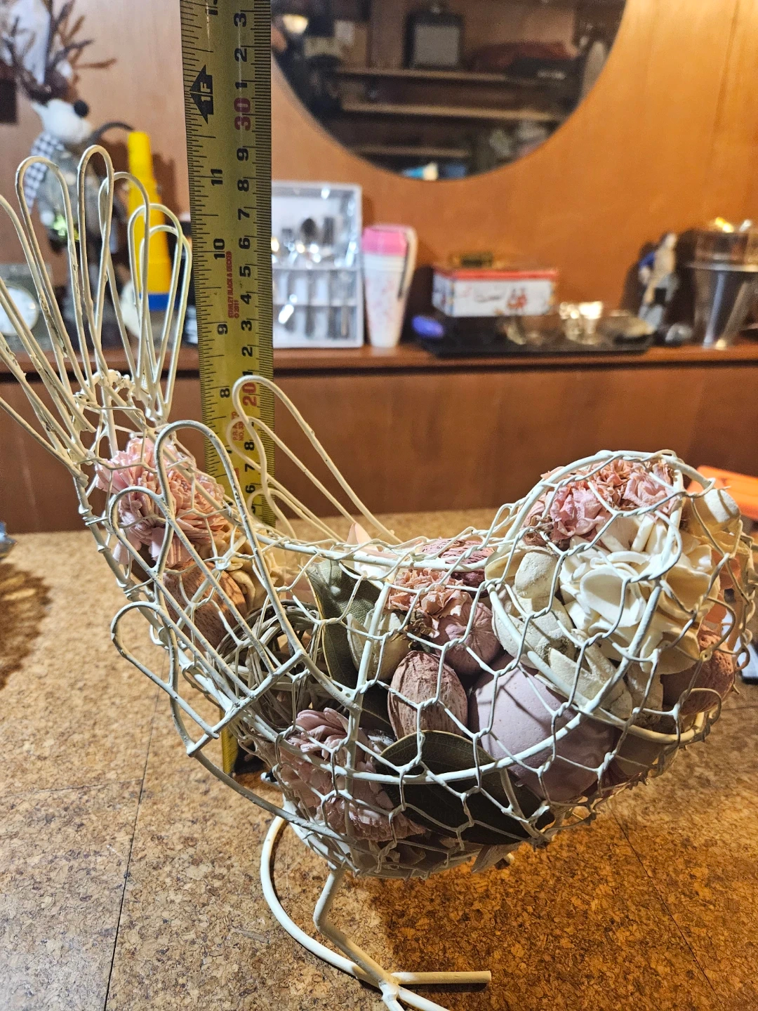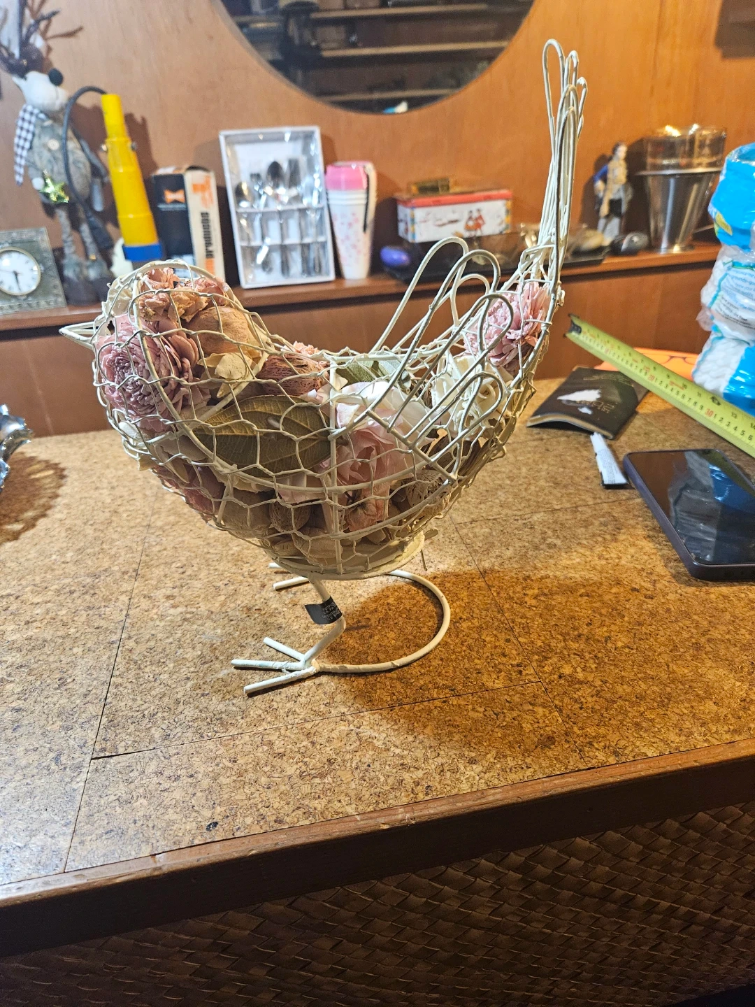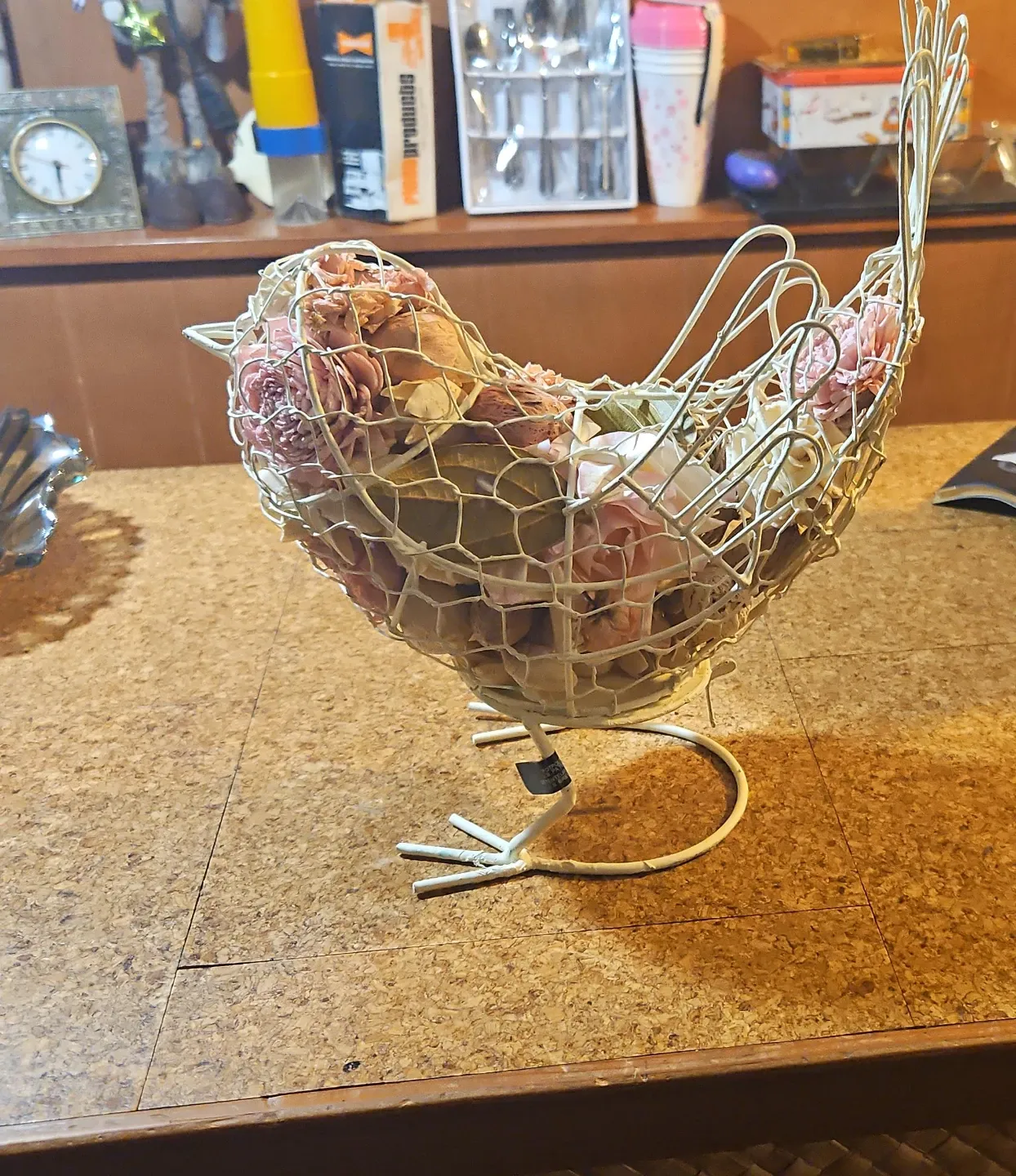 Decorative wire bird basket filled with dried flowers. It's a charming accent piece for any home. Great for holding small items or as a decorative display!