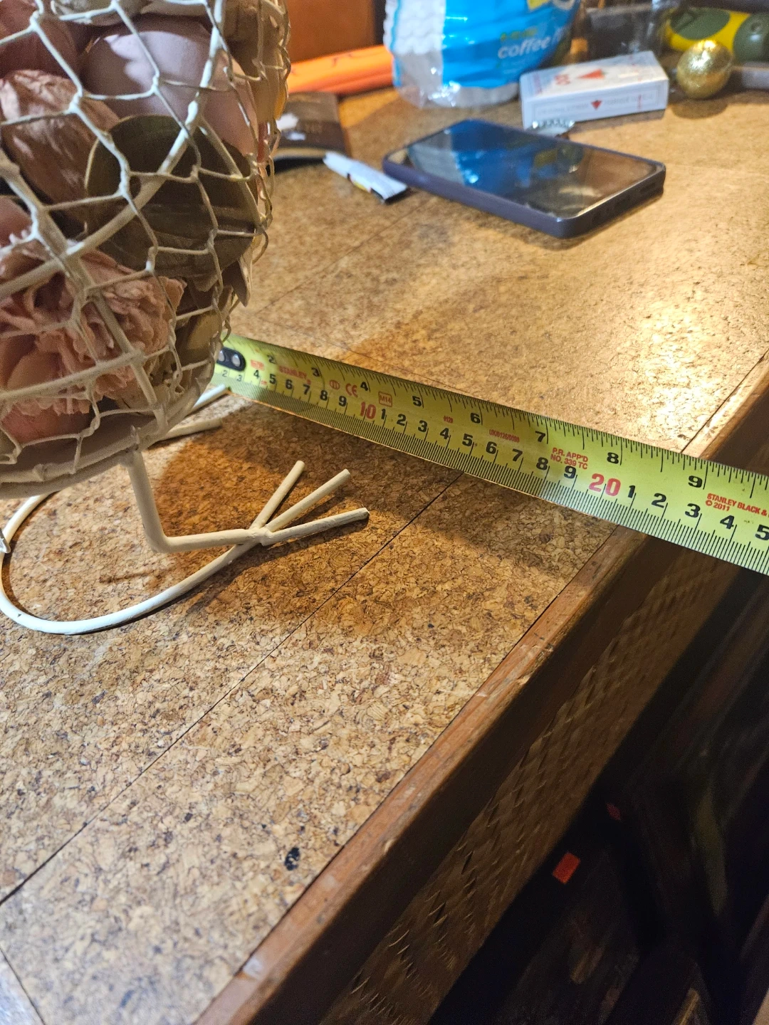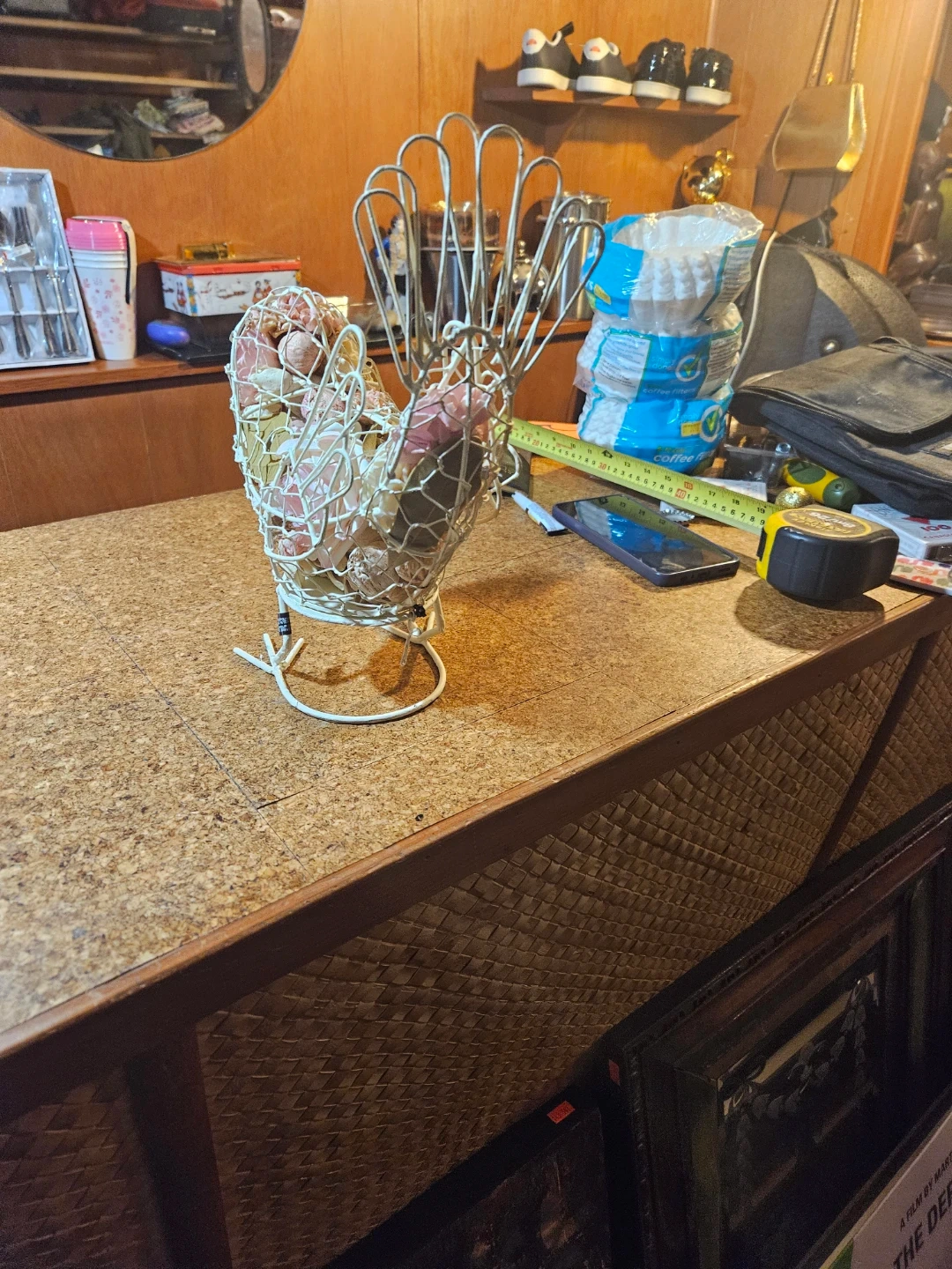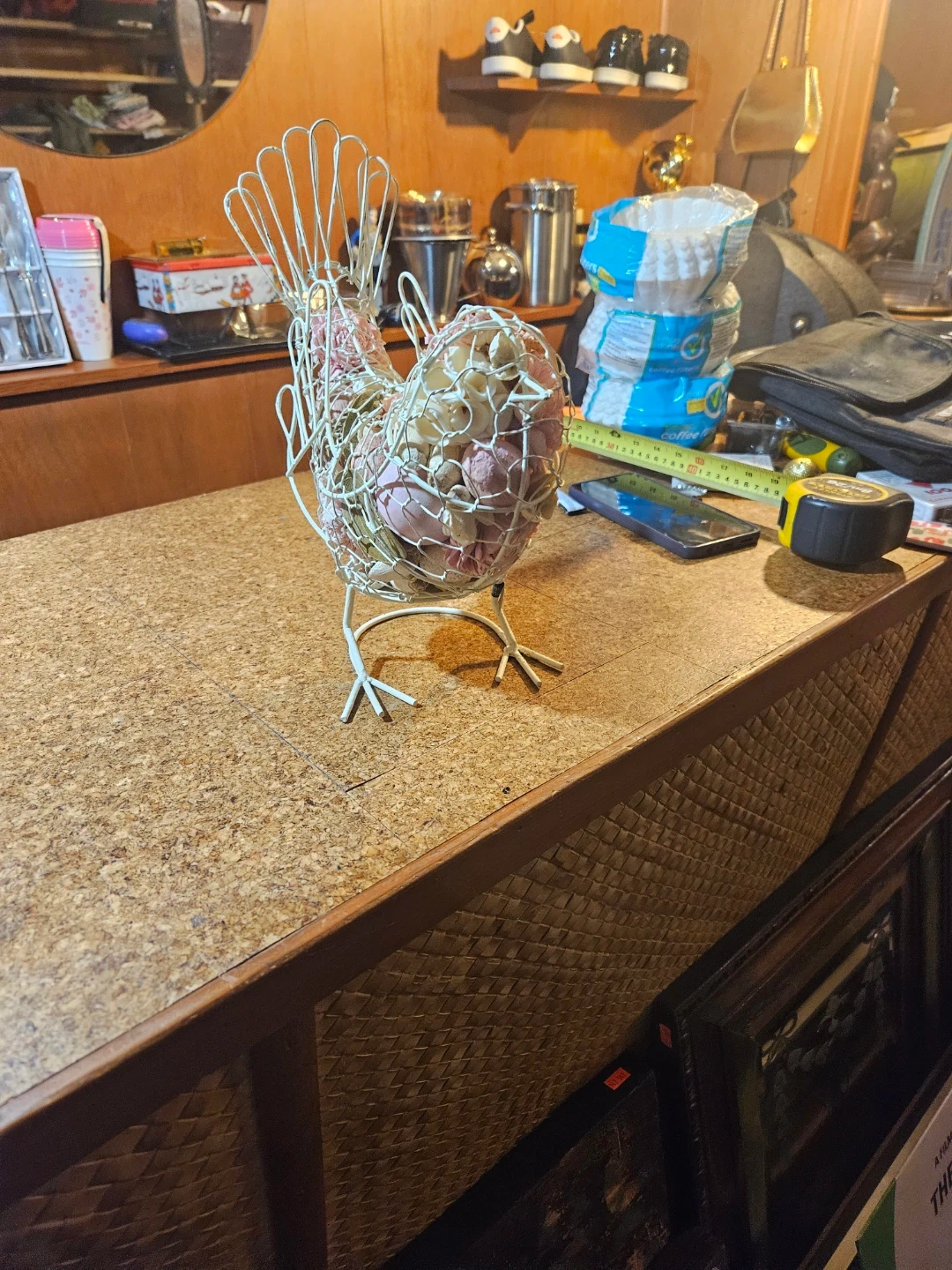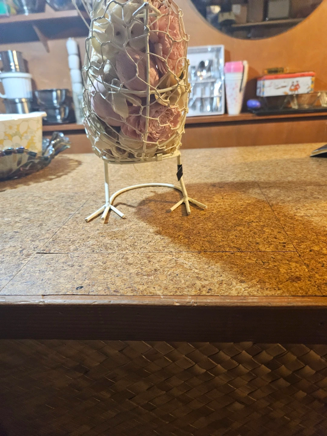 Decorative wire bird basket filled with dried flowers. It's a charming accent piece for any home. Great for holding small items or as a decorative display!