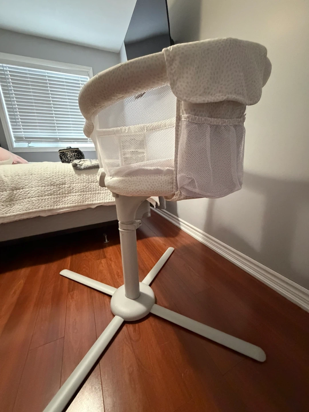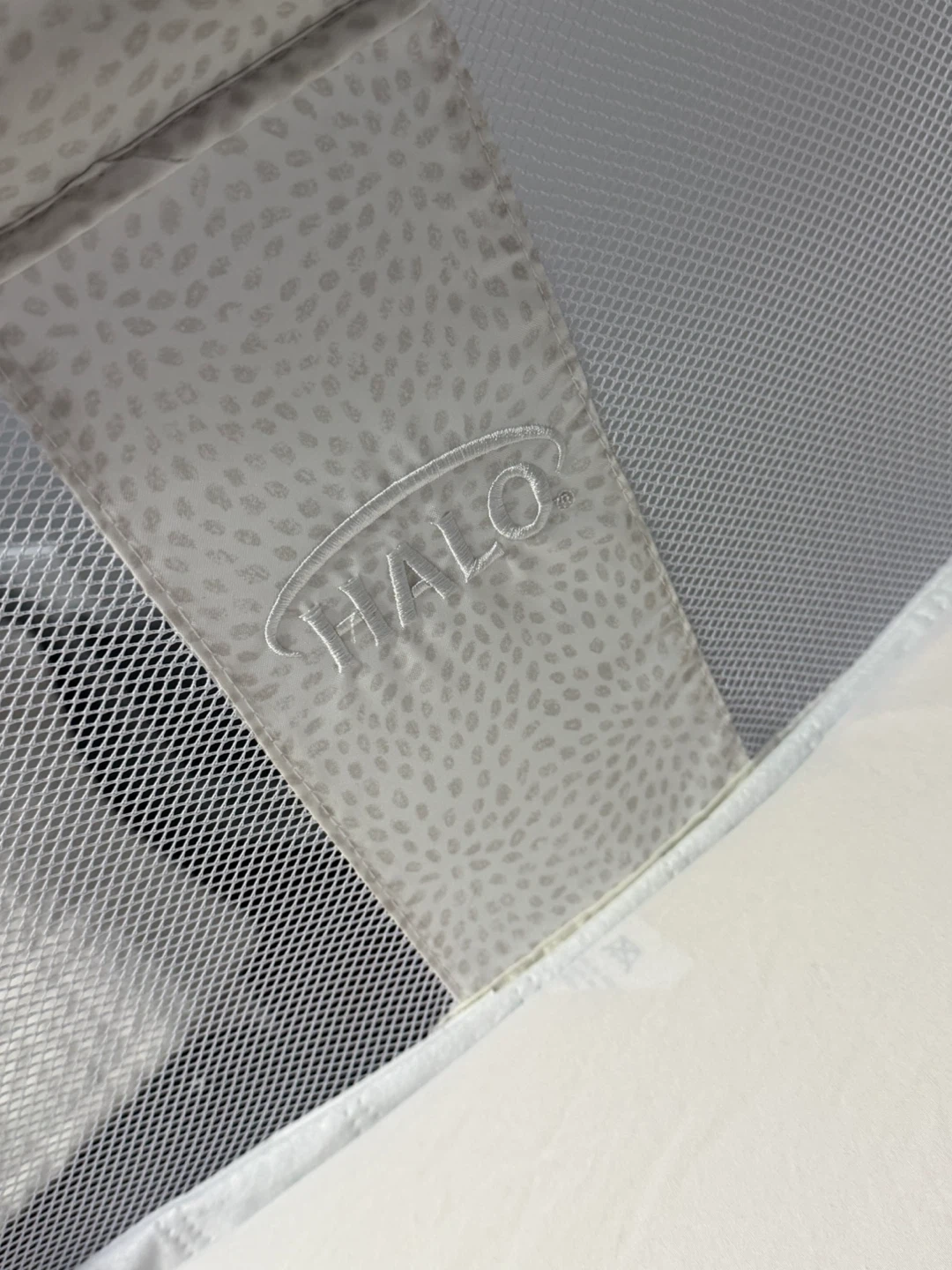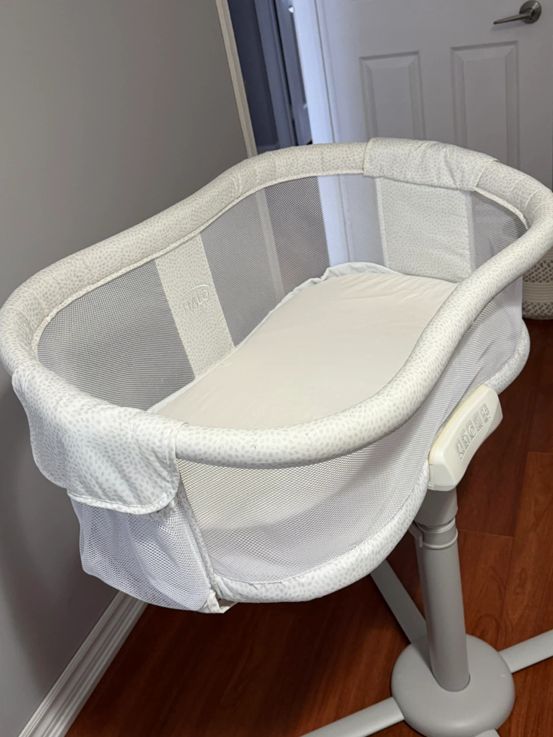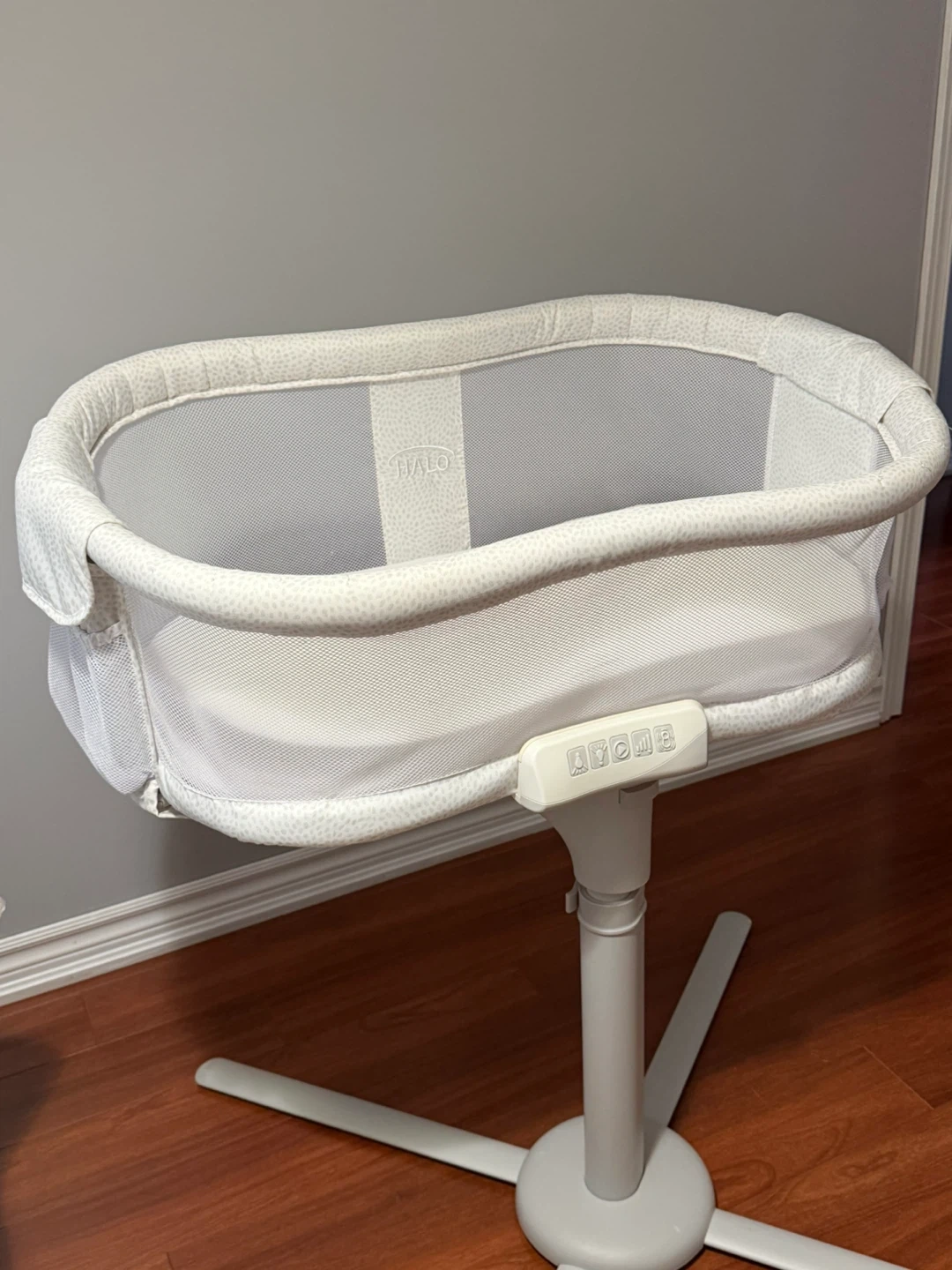 HALO Bassinet swivel sleeper for babies. Features mesh sides for breathability and a stable base. It has storage pockets on both sides. Built-in white noise, nightlight, and soothing vibration movement settings.