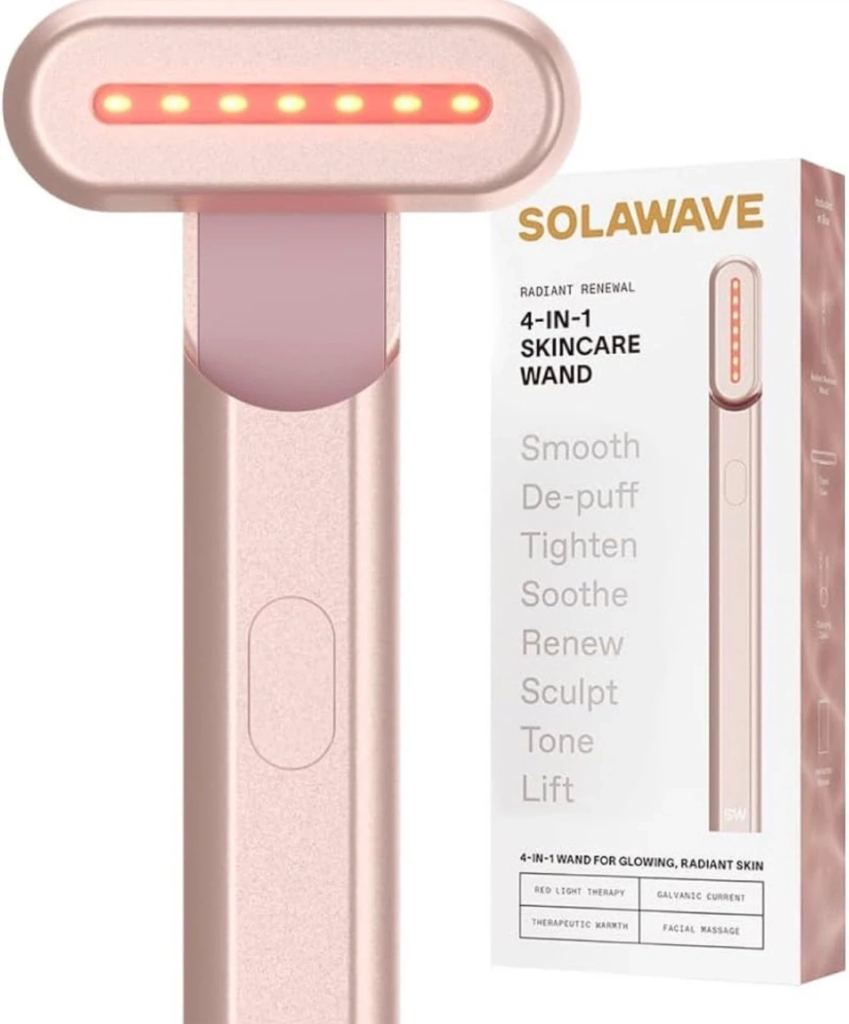 This Solawave wand offers 4-in-1 skincare treatment with red light therapy, galvanic current, therapeutic warmth, and facial massage. It's designed for targeted treatments, with a 3-minute auto timer per area for a full-face session in 12 minutes. Experience a spa-like glow at home with this device!