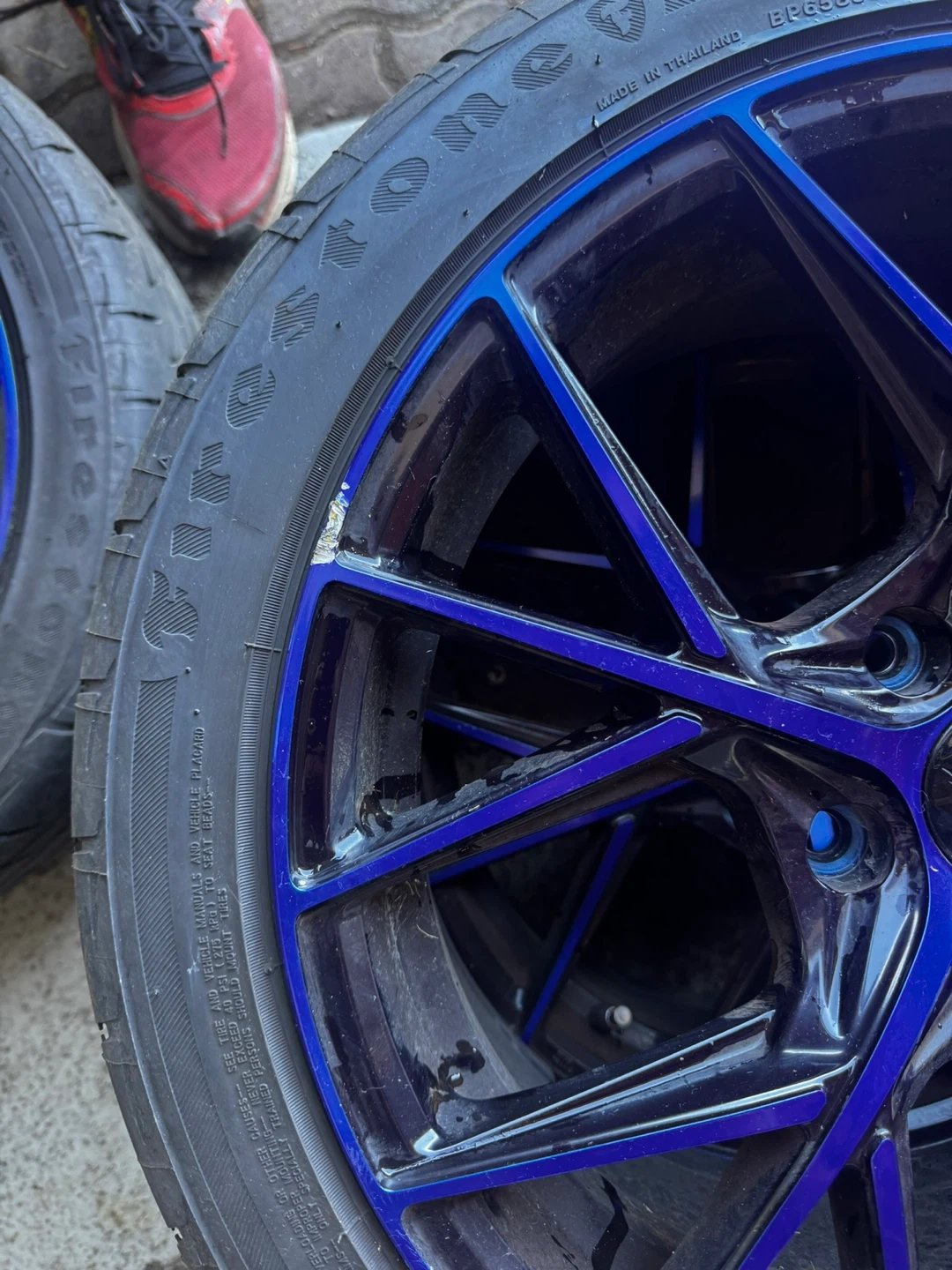 Set of tires with 17-inch rims. The tires are 215/45R17 91W. Rim size is 17 inches with a blue accent. Lug nuts included in original packaging. Indy hawk tires are basicly brand new maybe 150 km on them some curb rash see photo