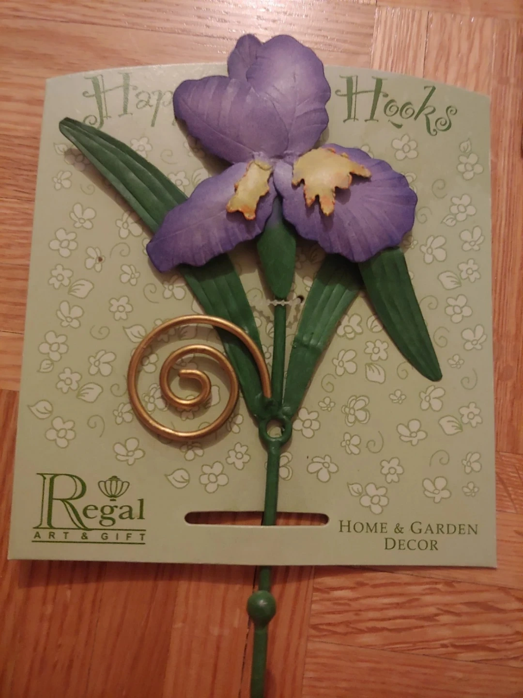 Set of 4 decorative wall hooks featuring a purple iris flower design. They're great for hanging keys, towels, or light coats. Home & Garden Decor. All new and come with the screw. Made of metal, but are light. One is open but it's new too. Pencil there for sizing. All for $10