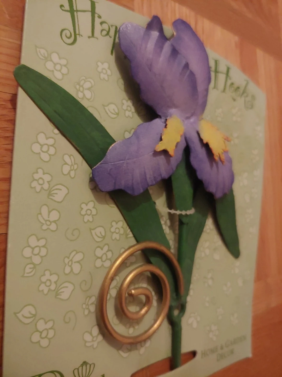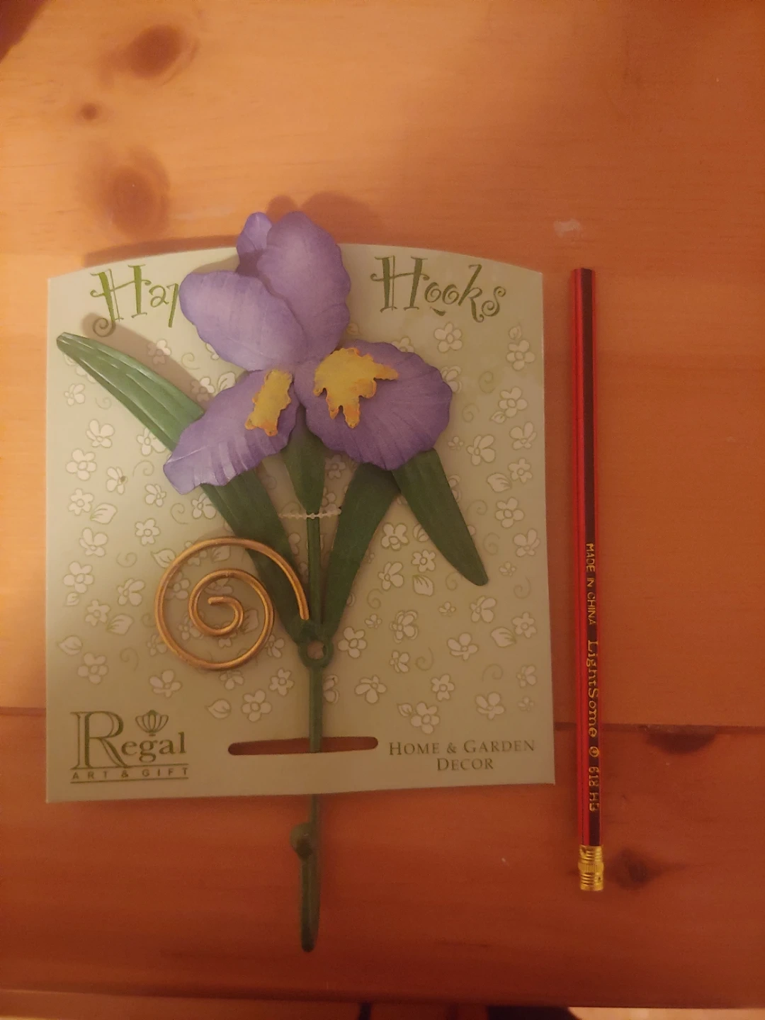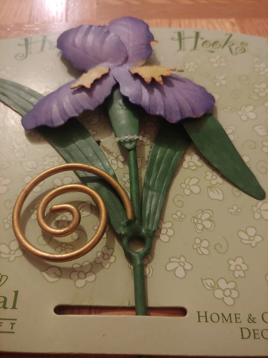 Set of 4 decorative wall hooks featuring a purple iris flower design. They're great for hanging keys, towels, or light coats. Home & Garden Decor. All new and come with the screw. Made of metal, but are light. One is open but it's new too. Pencil there for sizing. All for $10